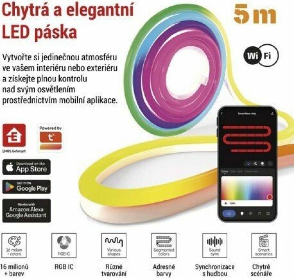 Chytré bydlení je ještě dostupnější Vytvořte si vlastní inteligentní domácnost s chytrými zařízeními EMOS GoSmart s platformou TUYA. Propojujte jednotlivé produkty, nastavujte automatizace jejich činností a ovládejte je vzdáleně pomocí plně lokalizované a intuitivní mobilní aplikace. Ohebný LED pásek NEON, 5m Objevte kouzlo osvětlení s naším Smart ohebným LED páskem NEON! Tento 5 metrů RGB-IC pásek s více jak 16 miliony barvami nabízí segmentové ovládání barev a je plně ovladatelný pomocí bezplatné aplikace EMOS GoSmart, která je dostupná pro Android i iOS. Nastavte si barvy, jas a osvětlení