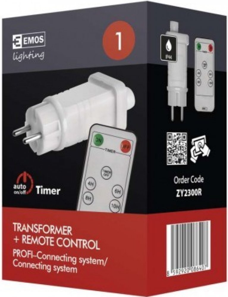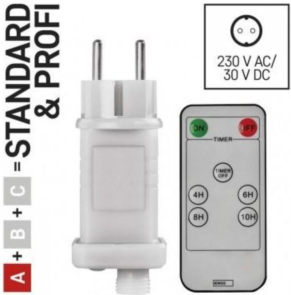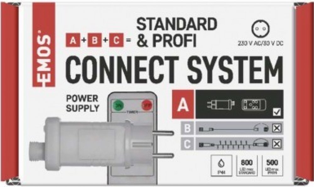 Napájecí zdroj pro Connecting system s dálkovým ovládáním snadno zapojíte do jedné 230V zásuvky. Slouží k napájení vzájemně propojení vánočních světelných řetězů, závěsů a sítí, díky kterým ozdobíte svůj dům, střechu i fasádu během adventního času. Pomůže vám s osvětlením velkých ploch v interiéru i na zahradě díky vysokému stupni krytí IP44. Dokáže propojit až 1000 LED světélek zároveň. Součástí balení je také dálkový ovladač (CR2032). Balení neobsahuje přívodní kabel.
