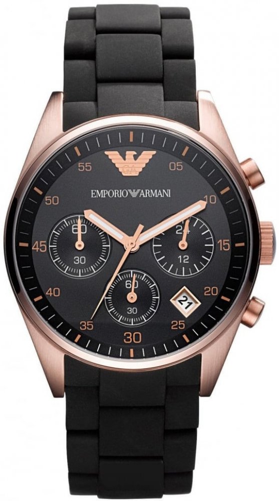 EMPORIO ARMANI AR5906 ZÁKLADNÍ PARAMETRY: Určení: Dámské Pouzdro:Z ušlechtilé oceli Řemínek:Z ušlechtilé oceli Sklo:Tvrzené minerální Ciferník:černý Vodotěsnost:5atm šířka ciferníku: 38 mm výška ciferníku: 10 mm FUNKCE: Datum stopky Čas: analogové zobrazení Napájení QUARTZ: životnost baterie cca 2 roky Záruka: 2 roky S hodinkami je dodáváno originální příslušenství, včetně boxu, instrukcí a originalního bookletu značky. Značka Emporio Armani Počátkem byl rok 1973, kdy se Giorgio Armani rozhodl založit vlastní značku, která se později rozrostla v obrovské módní impérium zahrnující také hodinky. Neobyčejně bohatý a rozmanitý profesní vývoj vedl Armaniho k likvidaci zbytečností, zdůrazňuje hlavně pohodlnost a sílu elegance nejdůležitějších částí jeho oděvů. Tento filosofický přístup je považován za základ jeho návrhářství a jeho úspěchu ve světě módy. V roce 1981 Armani rozšířil své impérium o značku Emporio Armani, která byla více zaměřena na unisexové oblečení. Byla mladší, sportovnější, uvolněnější a hlavně dostupnější.