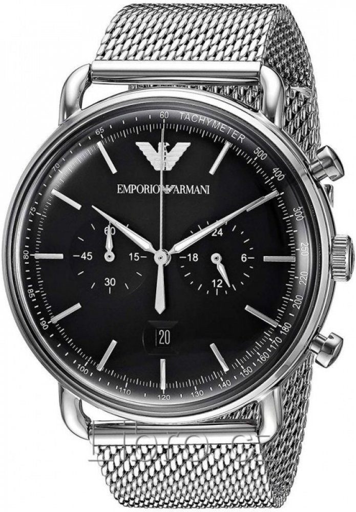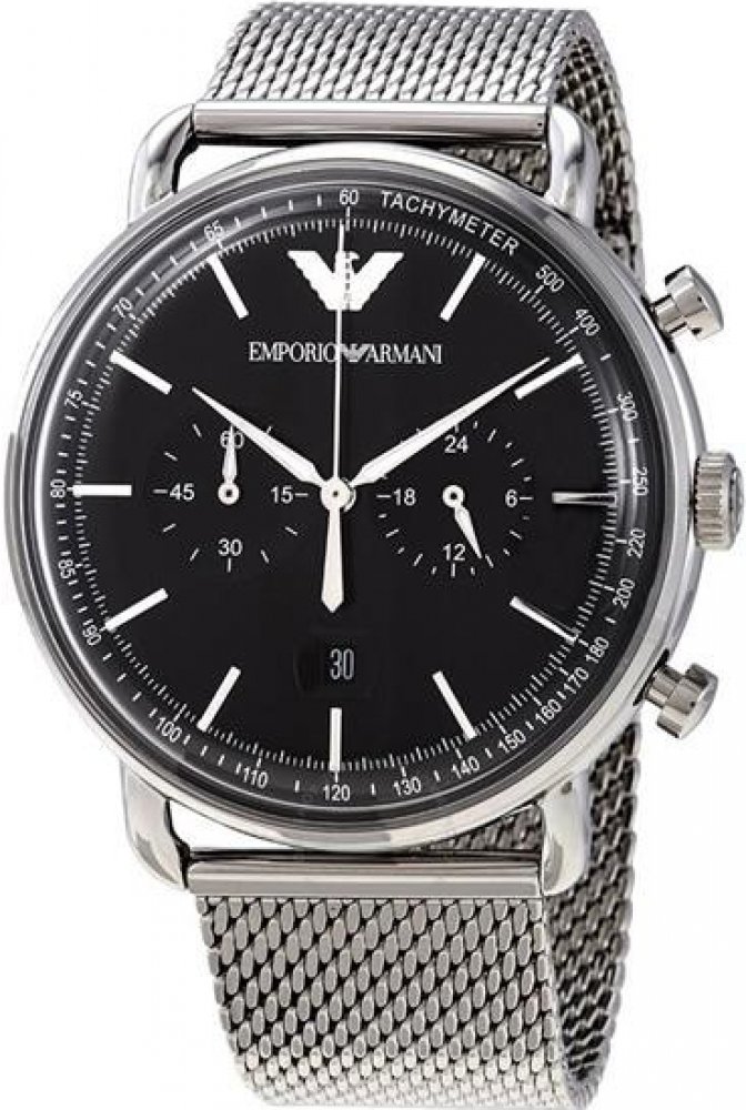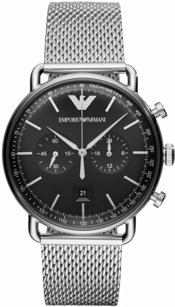 Módní hodinky Armani (Emporio Armani) z kolekce Aviator. Ideální doplněk pro muže upřednostňující analogové a kulaté hodinky. Uvnitř odolného, 12 mm vysokého pouzdra, které tvoří kvalitní ocel, najdete spolehlivý bateriový (quartz) strojek pohánějící v průměru 43 mm široký ciferník. Ten spolehlivě chrání odolné minerální sklíčko. Jak sami vidíte, pouzdro zahalila stříbrná, ciferník černá a řemínek...