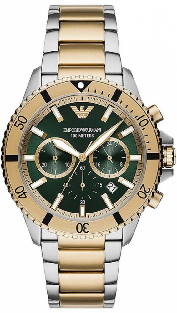Emporio Armani analogové ocel sportovní pánské bateriové - quartz pro potápění (100+ m) 43.0 mm ocel 100 m bateriové minerální 21 cm bez osazení Diver kulaté vícebarevná zelená se superluminou skládací spona 2.2 cm na ruku s arabskými číslicemi 4.3 cm střední jednosměrně otočná 12.0 mm 22.0 mm 3 12.0 mm 43.0 mm s trvalým svícením (tritium/Super-LumiNova) s nenáročnou údržbou (quartz) bez chytrých funkcí