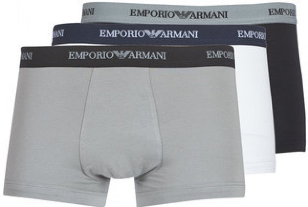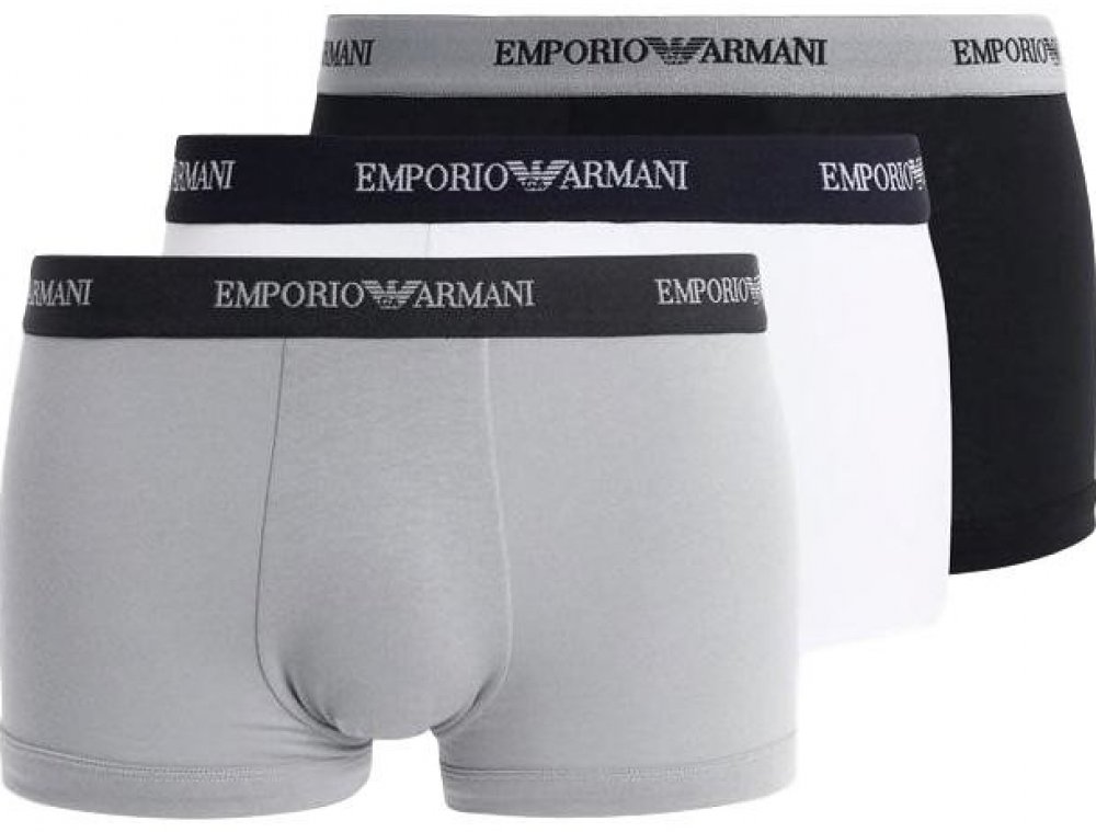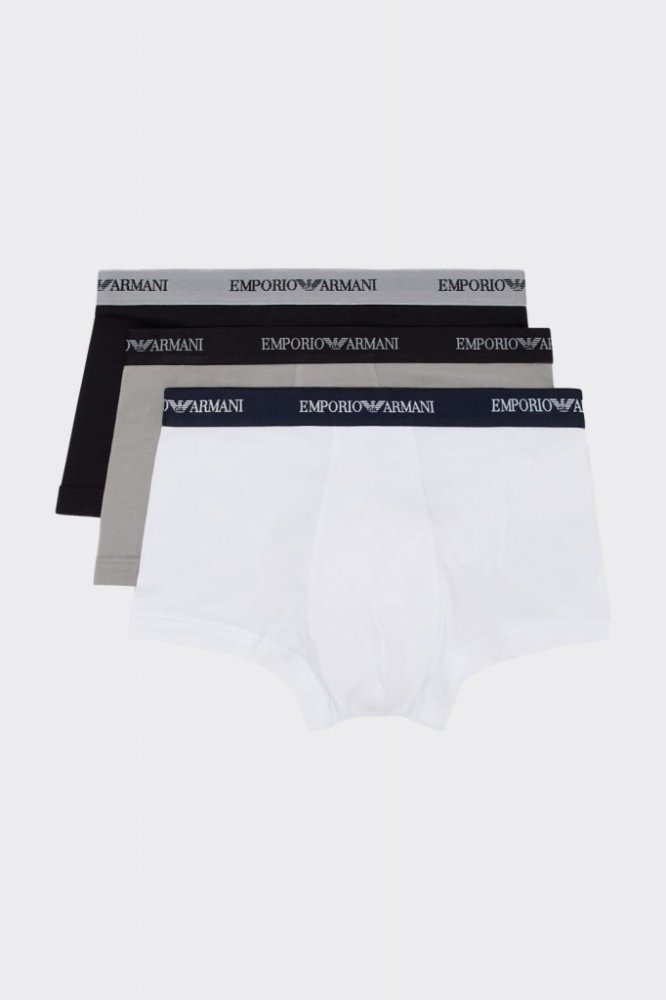 Luxusní pánské boxerky Emporio Armani v balení po třech kusech a třech barvách. V pase je pružná guma s nápisem a logem značky EA.