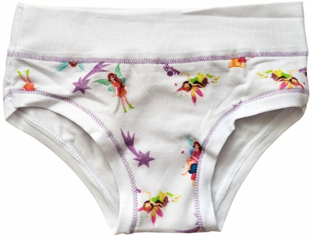 Dívčí kalhotky Emy Bimba zdobené obrázky kouzelných víl, v bílé barvě, bavlněné s plochými lemy a bez gumiček, velmi pohodlné, od 2 do 15 let
