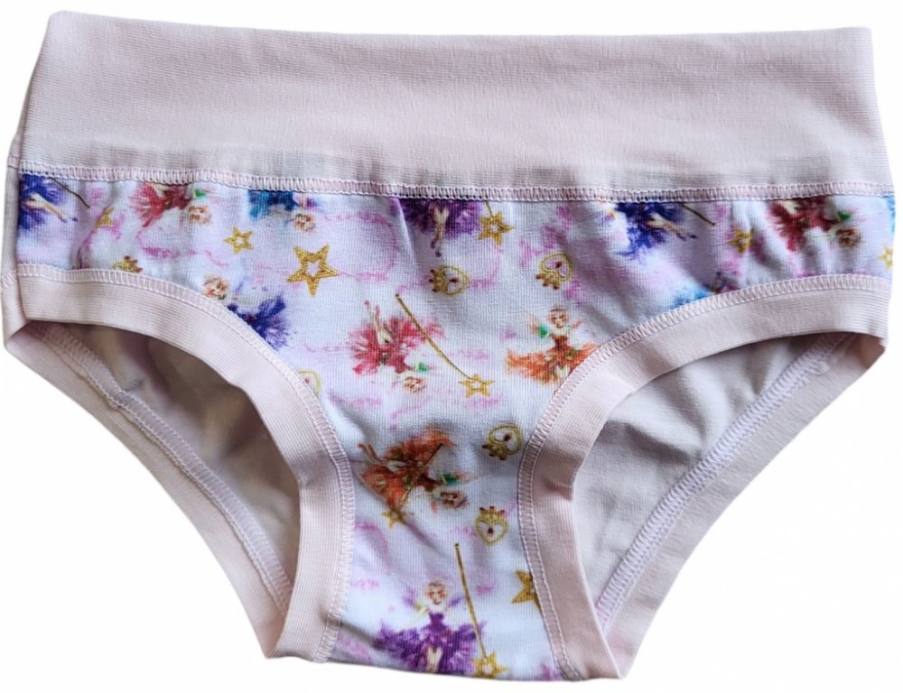 Dívčí kalhotky Emy Bimba zdobené obrázky kouzelných víl, v meruňkové barvě, bavlněné s plochými lemy a bez gumiček, velmi pohodlné, od 2 do 15 let