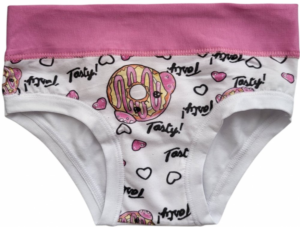 Dívčí kalhotky Emy Bimba zdobené obrázky donutů, bavlněné s plochými lemy a bez gumiček, velmi pohodlné, od 2 do 15 let