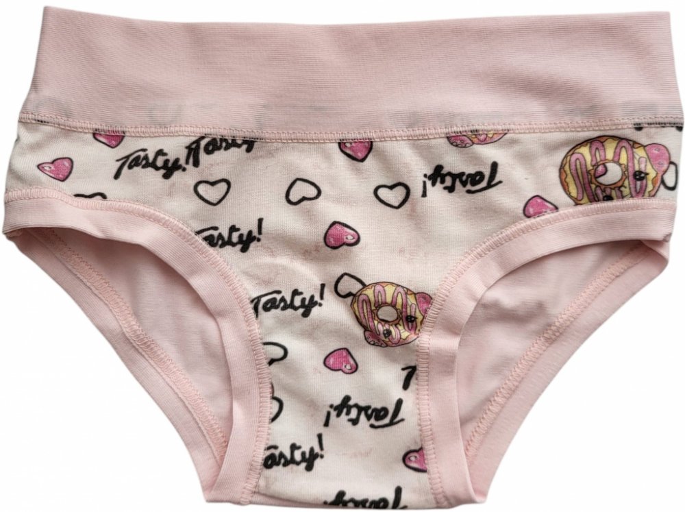 Dívčí kalhotky Emy Bimba zdobené obrázky donutů, bavlněné s plochými lemy a bez gumiček, velmi pohodlné, od 2 do 15 let