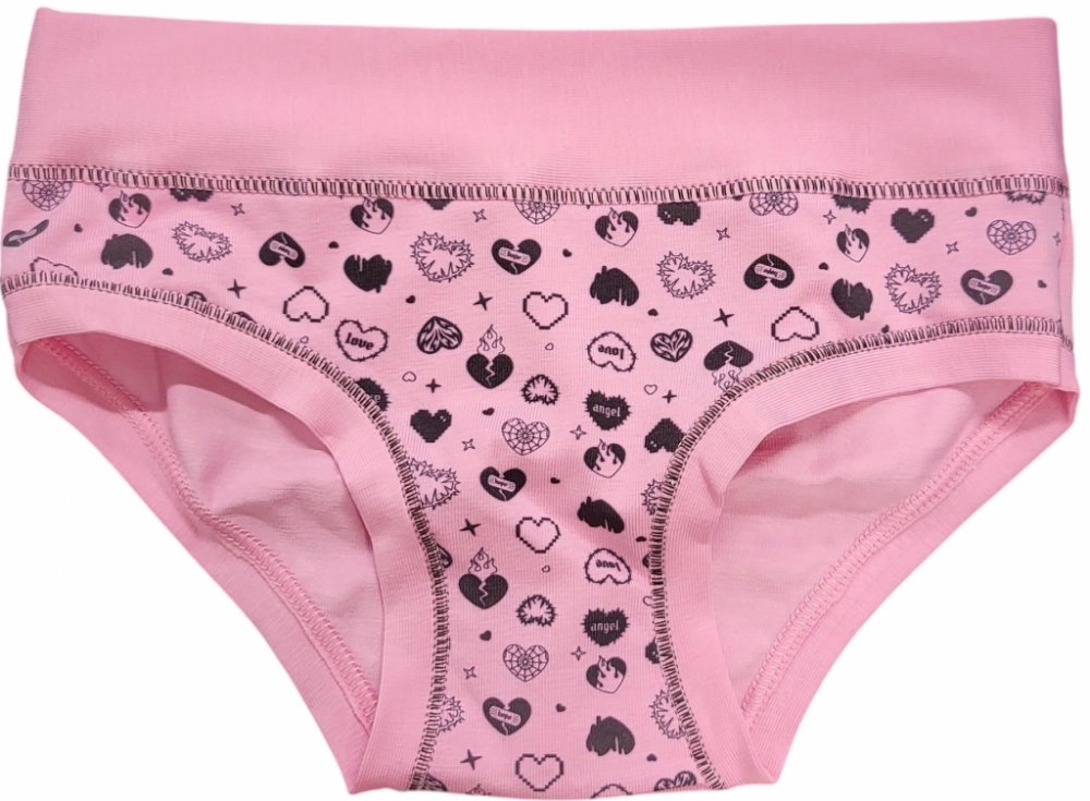 Dívčí kalhotky Emy Bimba zdobené obrázky srdíček, v růžové barvě, bavlněné s plochými lemy a bez gumiček, velmi pohodlné, od 2 do 15 let