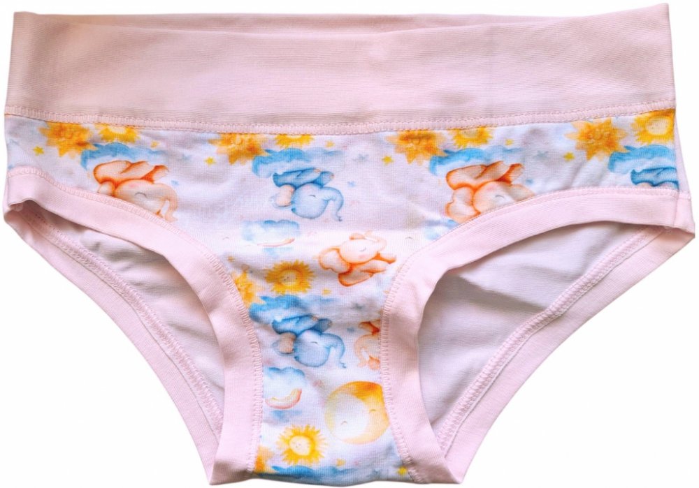 Dívčí kalhotky Emy Bimba zdobené obrázky spících slonečků, bavlněné s plochými lemy a bez gumiček, velmi pohodlné, od 2 do 15 let
