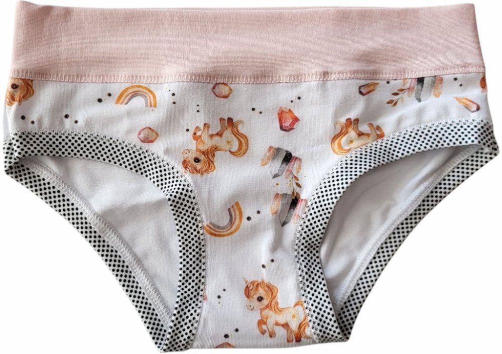 Dívčí kalhotky Emy Bimba zdobené obrázky jednorožce, bavlněné s plochými lemy a bez gumiček, velmi pohodlné, od 2 do 15 let