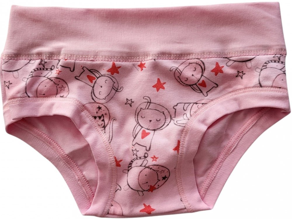 Dívčí kalhotky Emy Bimba zdobené obrázky spících kočiček, bavlněné s plochými lemy a bez gumiček, velmi pohodlné, od 2 do 15 let