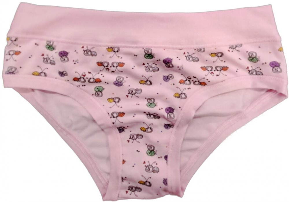 Dívčí kalhotky Emy Bimba zdobené obrázky veselých broučků, bavlněné s plochými lemy a bez gumiček, velmi pohodlné, od 2 do 15 let