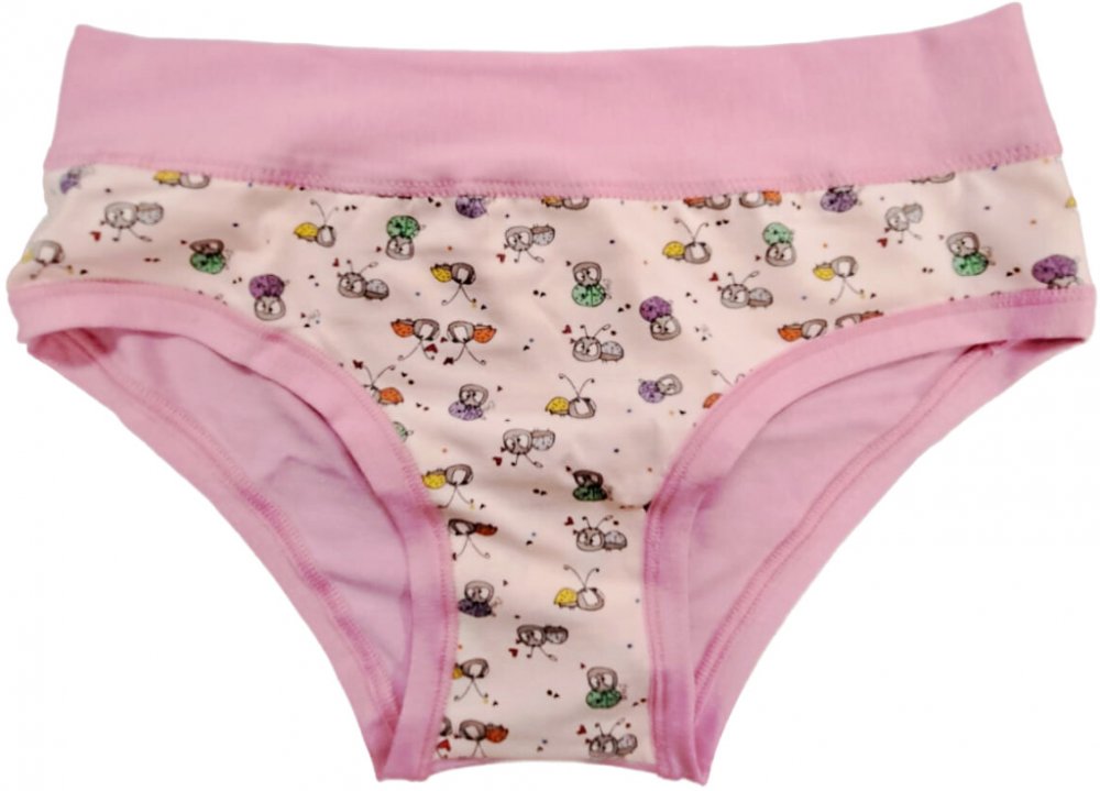 Dívčí kalhotky Emy Bimba zdobené obrázky veselých broučků, bavlněné s plochými lemy a bez gumiček, velmi pohodlné, od 2 do 15 let
