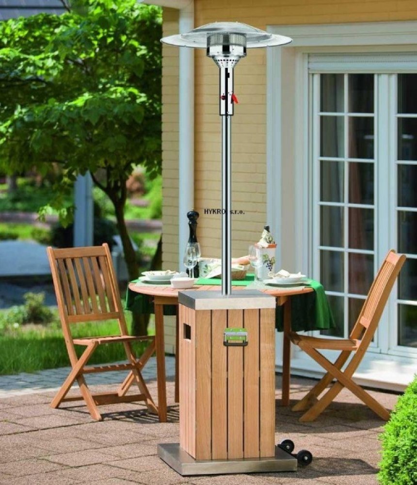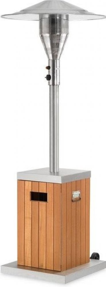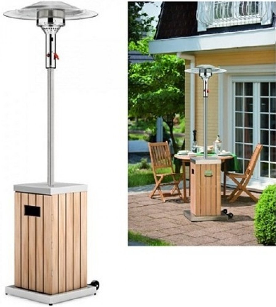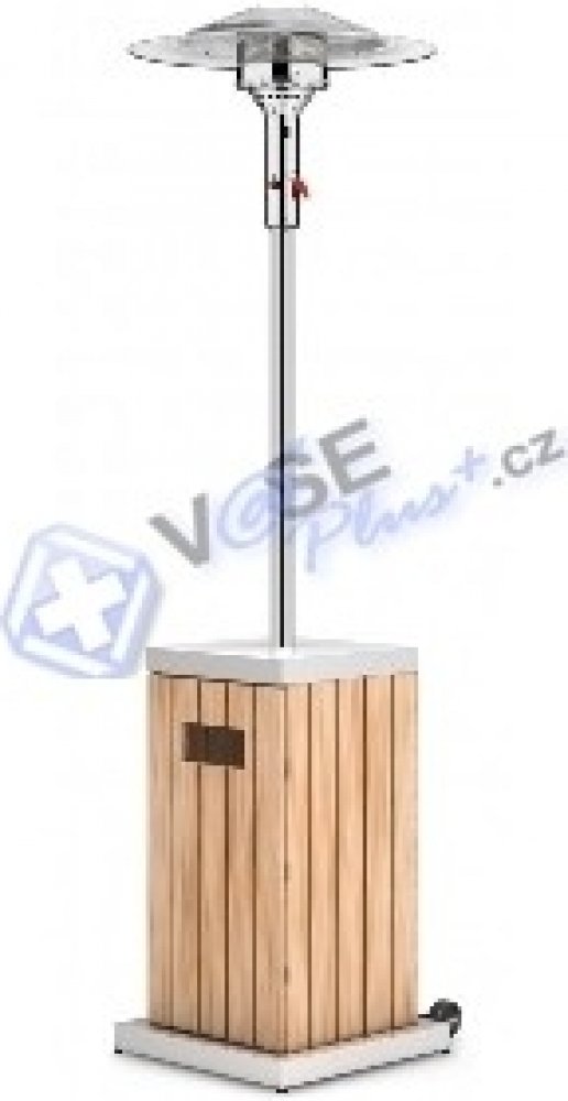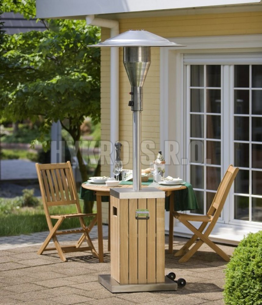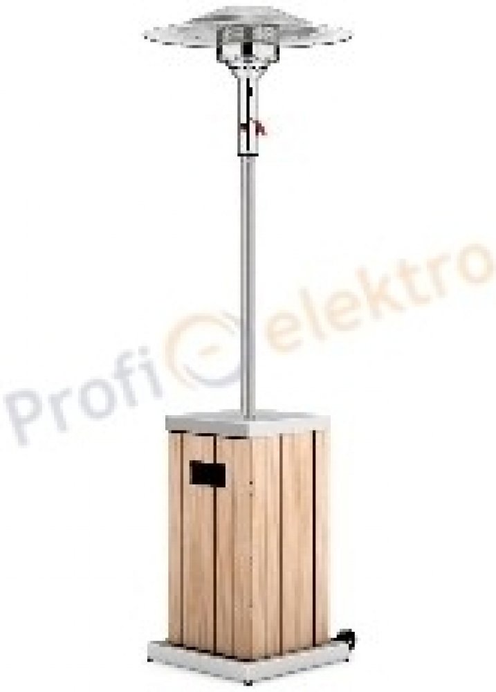 Podstavec, kryt skříně a nosná tyč je z leštěného nerezu, skříň je vyrobena ze dřeva. Tento plynový zářič má ekologický úsporný hořák, kde ušetříte až 30% nákladů na spotřebu plynu i emisí CO2 díky nové topné technologii EEP. Integrovaná transportní kolečka jsou součástí produktu. Doporučujeme přikoupit ochranný obal.