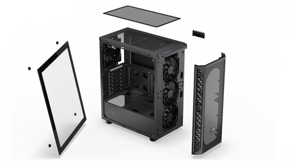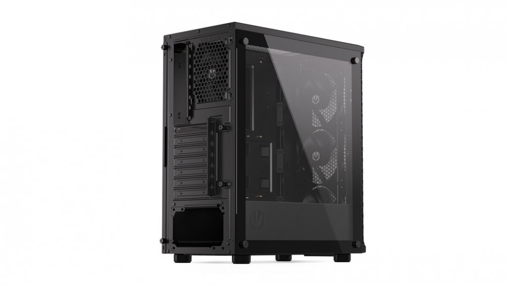 Skříň formátu Middle Tower s průhlednou bočnicí z tvrzeného skla nabízí dvě 2,5" pozice pro SSD disky a dvě 3,5" pozice pro pevné disky. Na horní části se nachází dva USB 3.0 porty, sluchátkový výstup a audio vstup pro mikrofon. Vybavena je čtyřmi 120 mm ventilátory, které spolu s perforovaným čelním panelem zajišťují dostatečné proudění vzduchu. Důmyslné řešení umožňuje poh...