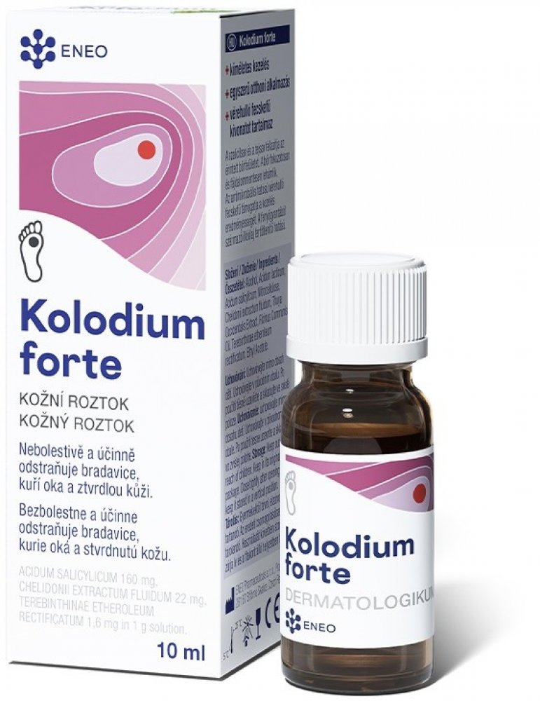 Zdravotnický prostředek Kolodium forte je určen pro šetrné odstranění ztvrdlé, zrohovatělé kůže, kuřích ok a bradavic tak, že způsobuje odloučení vrchní zralé, rohové, plně keratinizované vrstvy kůže tzv. keratolytickým účinkem.