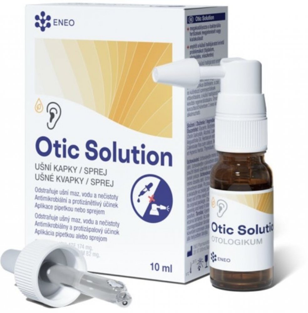 Otic Solution ušní kapky/sprej vhodný pro odstraňování mazu, vody a nečistot ze zevního zvukovodu, k mírnění obtíží (bolest, zarudnutí, svědění) a prevenci onemocnění zevního zvukovodu.