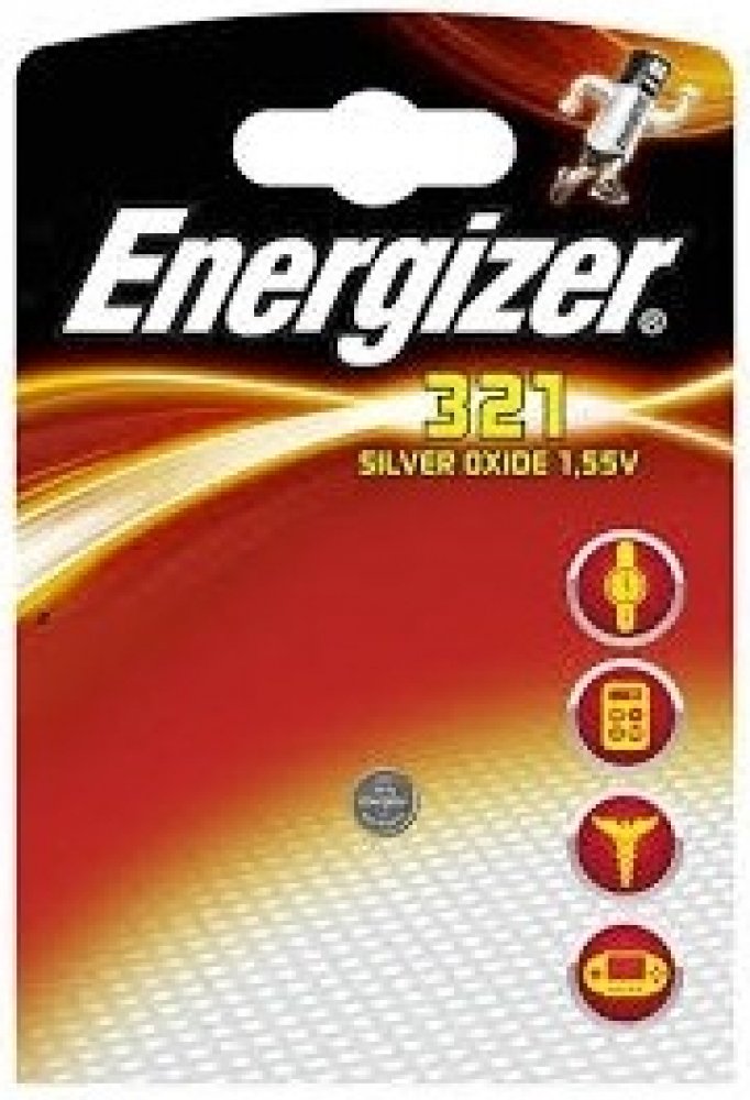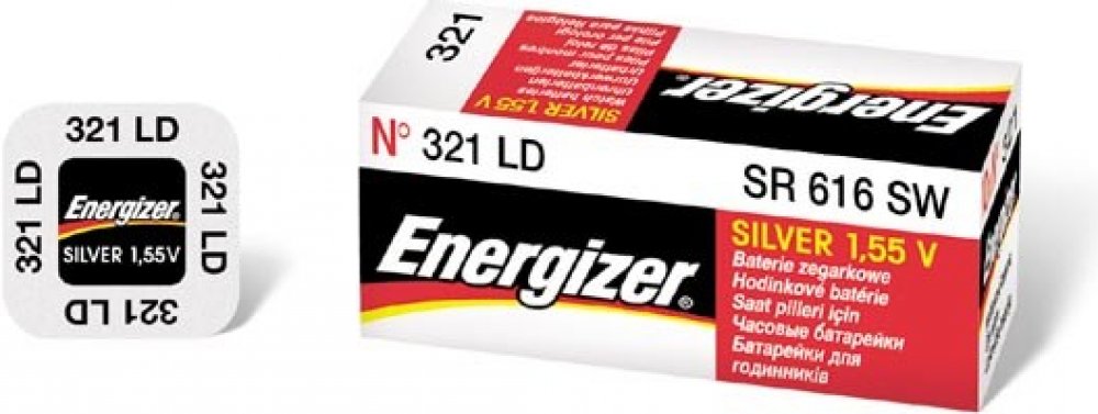 Stříbrozinková hodinková baterie 321 Energizer multi-drain.Napětí 1.55V.Ekvivalent baterií:SR616W,V321,D321,L616.Baterie neobsahují rtuť mají min.skladovatelnost 5let. V roce 1957 vyrobila společnost Energizer první baterii do hodinek.Záruka ochrany přístroje proti vytečenícena za 1 ks