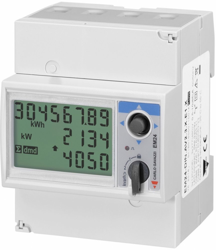 Měřič EM24 je určen pouze pro monitorování třífázových zařízení a zobrazení dat na zařízení GX a portálu VRM. EM24 je určen pouze pro třífázové monitorování a k dispozici je model s rozhraním RS485 i model s ethernetem. 120 až 277 V L-N, 208 až 480 V L-L, 10 (65) A, Modbus TCP/IP (Ethernet)