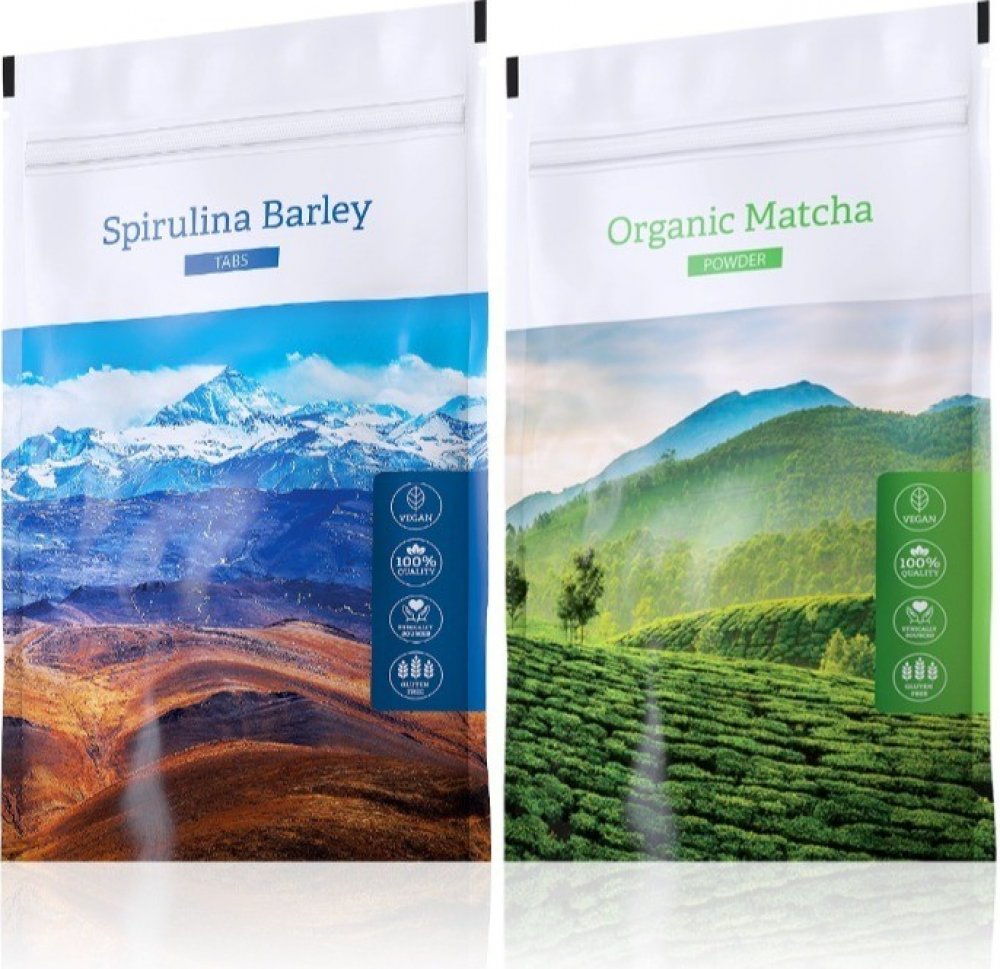 Doplněk stravy. Kombinace zelených potravin Spirulina Barley tabs a Organic Matcha powder se slevou 260 Kč.