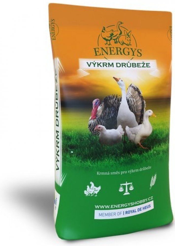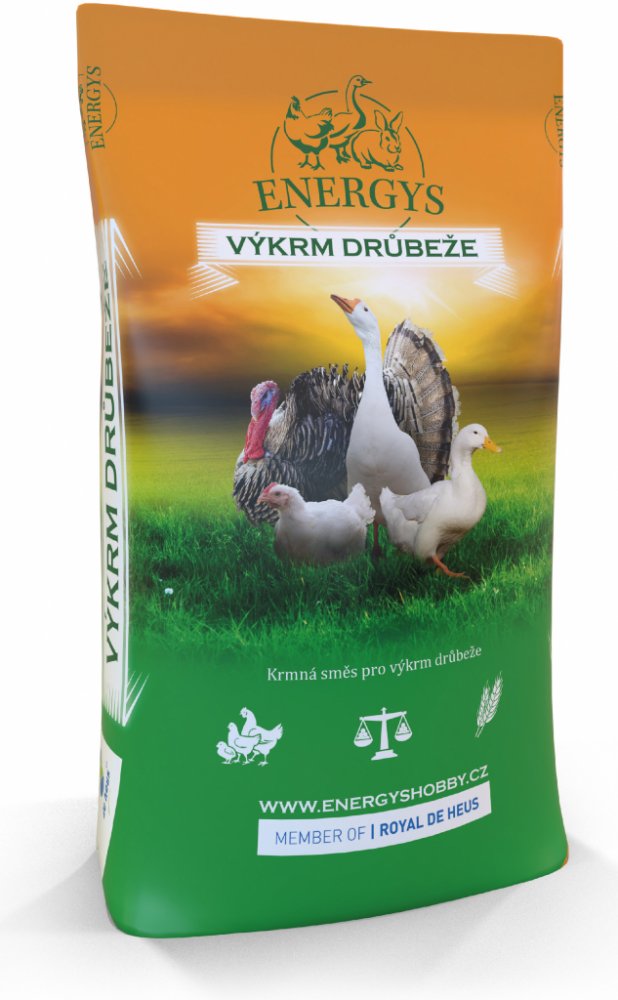Vysoce jakostní granulované krmivo pro intenzivní výkrm brojlerových kuřat v poslední fázi výkrmu, tedy min. 5 dní před jeho ukončením. Neobsahuje antikokcidika. Podporuje vysokou zmasilost a delikátní chuť masa Vašich brojlerů. Značka Energys hobby nabízí bohatý sortiment krmiv, které zajišťují zdravý vzhled a výkonnost zvířat. Nabídka zahrnuje vysoce kvalitní krmiva pro různá zvířata bez ohledu na jejich stáří. Tyto krmiva se vyrábějí v České republice. Značka Energys hobby nabízí bohatý sortiment krmiv, které zajišťují zdravý vzhled a výkonnost zvířat. Nabídka zahrnuje vysoce kvalitní krmiva pro různá zvířata bez ohledu na jejich stáří. Ve svém úsílí o nejlepší krmiva tento výrobce dosáhl skvělého poměru mezi kvalitou a cenou s ohledem na výživové hodnoty, použité suroviny či užitkovost. V oblasti kvality a bezpečnosti získal osvědčení, která potvrzují vysokou profesionalitu značky Energys hobby. De Heus a.s. je českým výrobcem kompletní řady krmných směsí, premixů, koncentrátů a krmných specialit. Závod a současně centrála v Marefách u Bučovic vyrobí ročně přes 150 000 tun krmných směsí. Stejný objem vyprodukuje i další závod v Běstovicích u Chocně, což řadí tuto firmu k předním výrobcům v České a Slovenské republice. Je součástí úspěšné rodinné firmy De Heus, která působí v mnoha zemích po celém světě. Její centrála se nachází v nizozemském Ede-Wageningenu spolu s moderní výzkumnou laboratoří. Je výrobcem krmiva značky Energys® a Energys® Hobby.