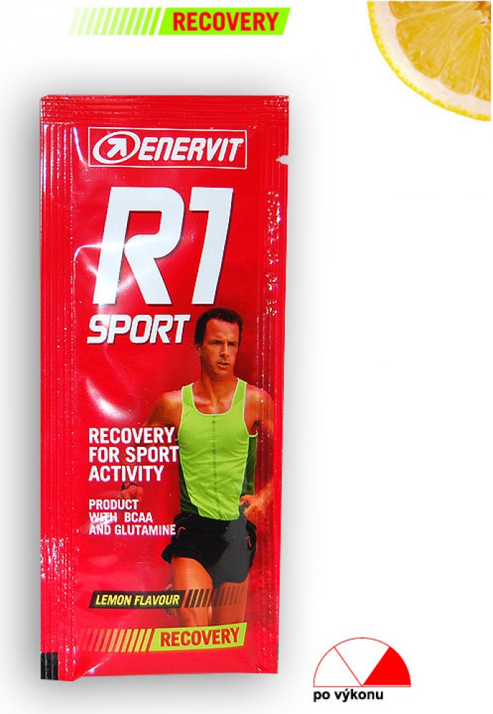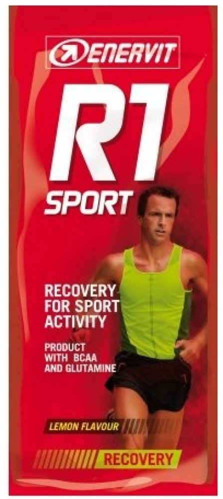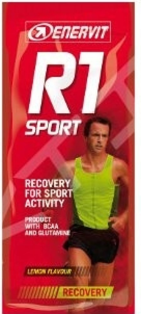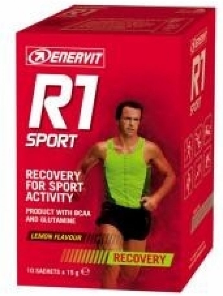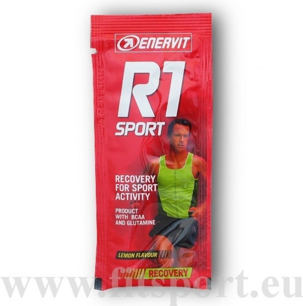 Povýkonový nápoj Enervit R1 SPORT urychlující procesy obnovy sil organizmu po intenzivním sportovním výkonu. Sacharidy sacharóza a maltodextrin podporují rychlé doplnění zásob energie. Vysoké množství aminokyselin L-glutamin a BCAA (20 %) pomáhá se zachováním a růstem (obnovou) svalových vláken po intenzivním výkonu. Vhodný pro opětovné doplnění vypocených minerálních látek (sodík, draslík, hořčík) a vitaminů, které přispívají: hořčík ke správné elektrolytické rovnováze, vitamin C, a E k ochraně buněk před oxidativním stresem, vitamin C a B6 k udržení správné funkce imunitního systému po výkonu, kdy je organizmus díky vyčerpání výrazně oslaben, vitaminy C a B (B1, B3 a B6) ke snížení míry únavy a vyčerpání a ke správnému energetickému metabolismu, draslík, hořčík a vitaminy B1, B3 a B6 k obnovení správné činnosti nervové soustavy.