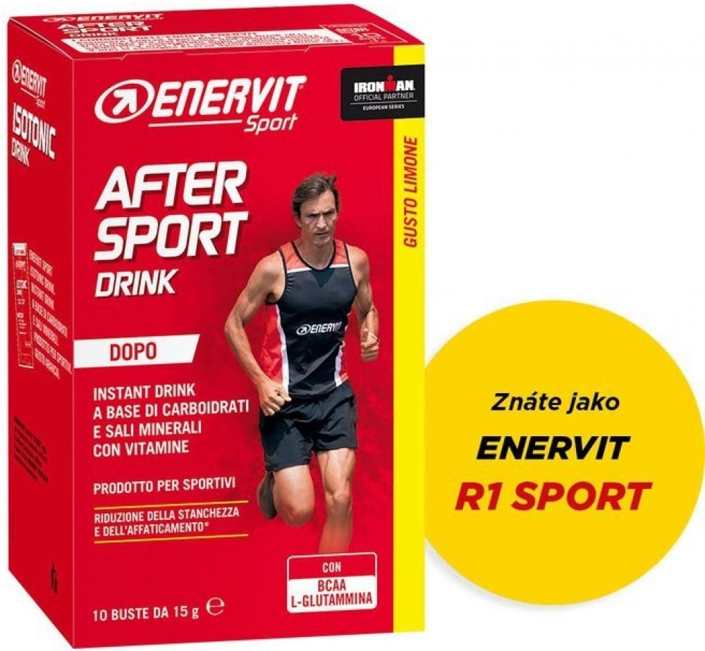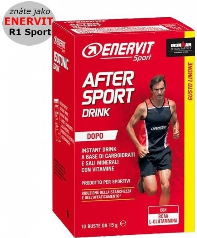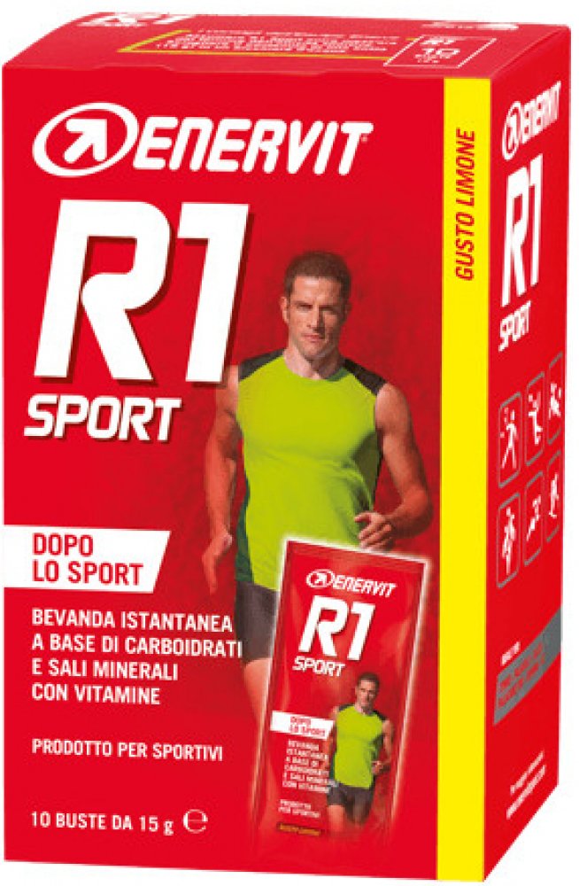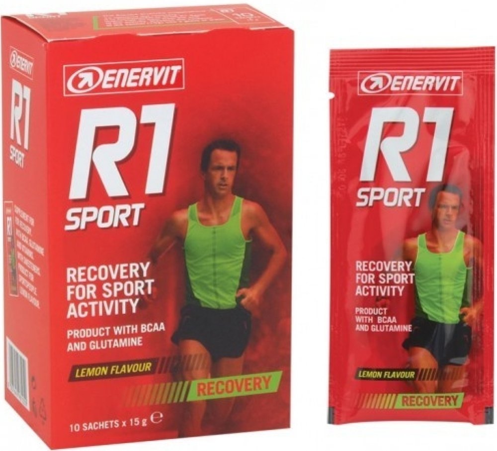 Povýkonový nápoj Enervit R1 SPORT urychlující procesy obnovy sil organizmu po intenzivním sportovním výkonu. Sacharidy sacharóza a maltodextrin podporují rychlé doplnění zásob energie. Vysoké množství aminokyselin L-glutamin a BCAA (20 %) pomáhá se zachováním a růstem (obnovou) svalových vláken po intenzivním výkonu. Vhodný pro opětovné doplnění vypocených minerálních látek (sodík, draslík, hořčík) a vitaminů, které přispívají: hořčík ke správné elektrolytické rovnováze, vitamin C, a E k ochraně buněk před oxidativním stresem, vitamin C a B6 k udržení správné funkce imunitního systému po výkonu, kdy je organizmus díky vyčerpání výrazně oslaben, vitaminy C a B (B1, B3 a B6) ke snížení míry únavy a vyčerpání a ke správnému energetickému metabolismu, draslík, hořčík a vitaminy B1, B3 a B6 k obnovení správné činnosti nervové soustavy.
