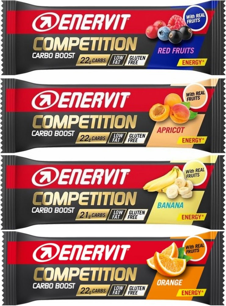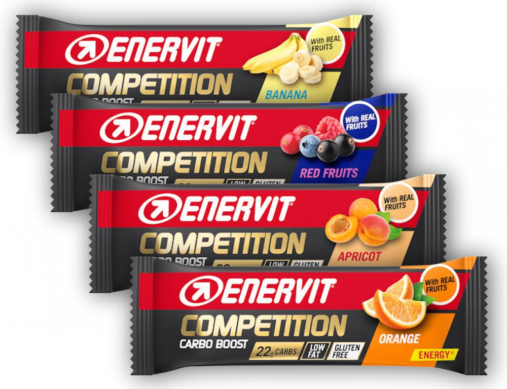 - Pro výkony se střední intenzitou (v rovnoměrné intenzitě) se hodí zejména tato Enervit Competition Bar – energetická tyčinka s nejvyšším obsahem sacharidů (ale má jich nejméně rychlých a jsou tedy spíše dlouhodobé).