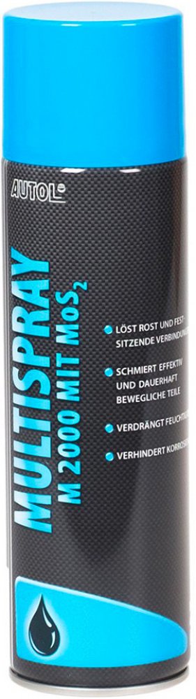 AUTOL M 2000 MULTI-SPRAY je speciální mazivo ve spreji s Molykou MoS2 pro mnohostranné použití v průmyslu, motorových vozidel a v oblasti hobby je multifunkční produkt, který se vyznačuje schopností rozpouštět rez, mazat, téci a krátkodobě účinkující ochrany proti korozi. Zapracované komponenty se starají o vynikající tekutost, pronikání vrstvami rzi, lpění na plochách a vytvoření mazací vrstvy. Běžný vznik jistého množství usazenin nebo obtížných spojení se zajišťuje použitím pevného maziva MoS2. Produkt je dodáván v aerosolových baleních, což činí použití nezávislým na přítomnosti zařízení na stlačený vzduch. Také zacházení s produktem se tím výrazně zjednodušuje. Produkt se používá pro motorová vozidla, stavební stroje, průmyslové stroje, v dílnách a také v oblastech hobby jako pomocný prostředek při sestavování a jako ochranný prostředek.