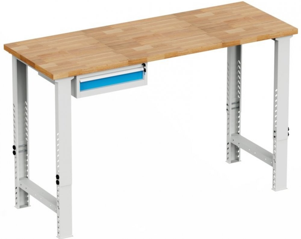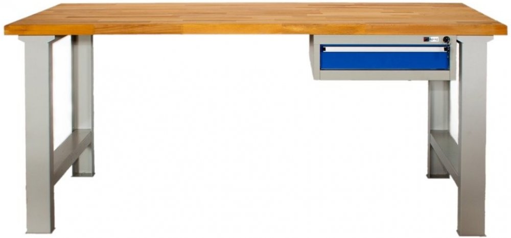 Pracovní deska 40 mm vodovzdorná buková spárovka. Noha výška 810, šířka 150, hloubka 699 mm. Podvěsný kontejner s jednou zásuvkou, výška 180, šířka 565, hloubka 580 mm. Stůl má nosnost 500 kg, výšku 850, šířku 1500, hloubku 750 mm, barva konstrukce světle šedá RAL 7035, barva zásuvky RAL 5015.