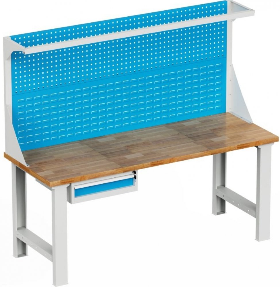 Pracovní deska 40 mm vodovzdorná buková spárovka. Noha výška 810, šířka 150, hloubka 699 mm. Podvěsný kontejner, výška 180, šířka 565, hloubka 580 mm. Stolov nástvba s perfopanely výška 920, šířka 1500, hloubka 350 mm. Stůl má nosnost 500 kg, výška pracovní desky 850, celkový výška stolu s nástavbou 1770, šířku 1500, hloubku 750 mm, barva konstrukce světle šedá RAL 7035, barva zásuvky a perfopanel...