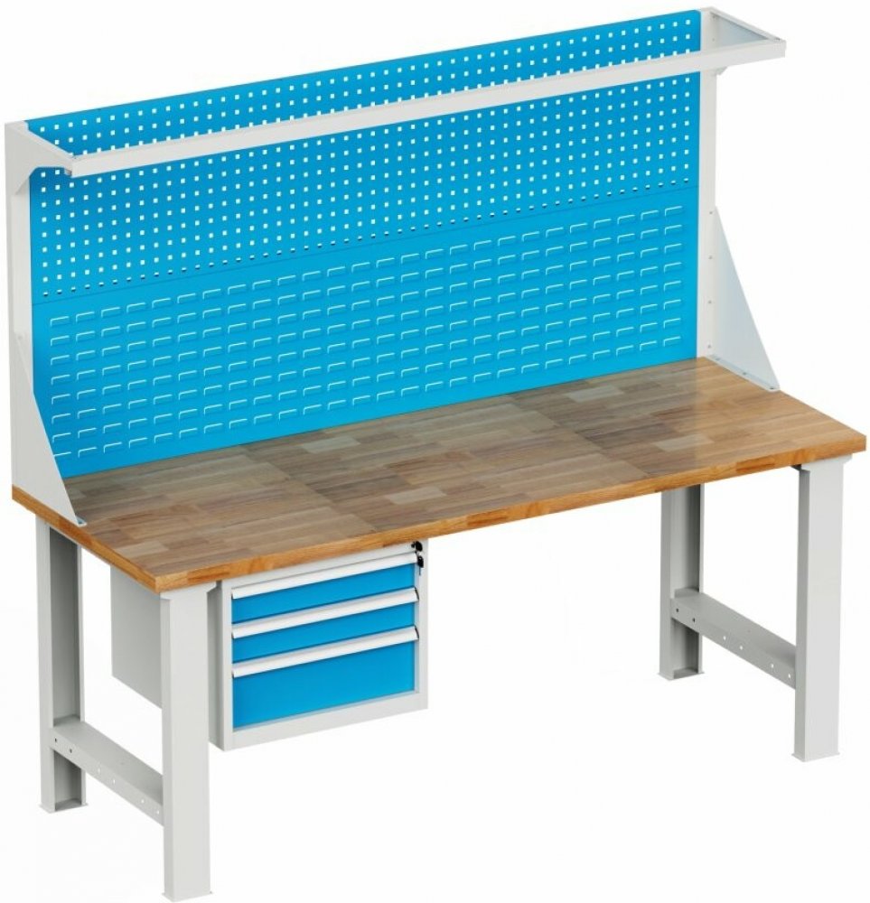 Pracovní deska 40 mm vodovzdorná buková spárovka. Noha výška 810, šířka 150, hloubka 699 mm. Podvěsný kontejner se třemi zásuvkami, výška 450, šířka 565, hloubka 580 mm. Stolov nástvba s perfopanely výška 920, šířka 1500, hloubka 350 mm. Stůl má nosnost 500 kg, výška pracovní desky 850, celkový výška stolu s nástavbou 1770, šířku 1500, hloubku 750 mm, barva konstrukce světle šedá RAL 7035, barva z...