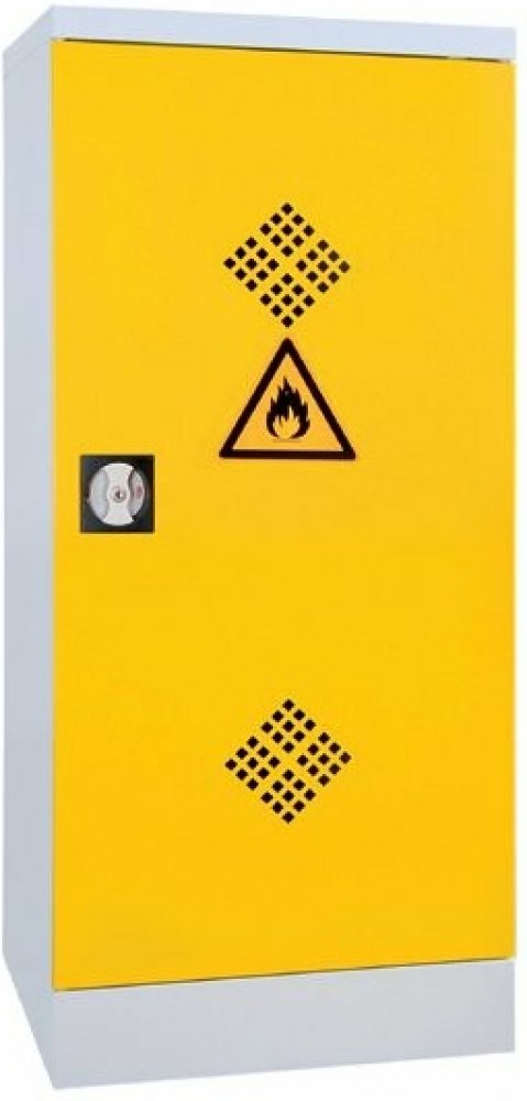 Skříň na uskladnění chemikálií s vaničkami na zachycení kapalin. Skříň je vybavena 2 přestavitelnými policemi ve tvaru vaničky. Výška 1000 x šířka 500 x hloubka 422 mm, nosnost police 50 kg, nosnost korpusu 150 kg. Barva korpusu šedá RAL 7035, barva dveří žlutá RAL 1021.