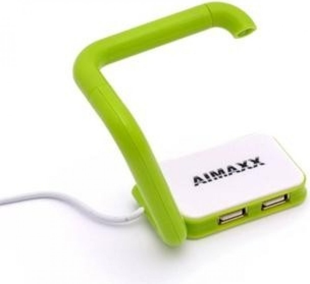 Svěžest a lehkost jsou skombinovány do tohoto užitečného zařízení. Čtyřportový USB hub je hravou formou doplněn o skládací lampičku. Světlo je možné použít jako přídavné, například při psaní na klávesnici. Pro zdůraznění svěží zelené AIMAXX barvy je i LED světlo v příjemné zelené barvě. Celé zařízení je lehké, kompaktní a snadno přenosné. Tech. specifikace: Porty 4 x USB 1.1/2.0 Přenosová rychlost až 480 Mbps