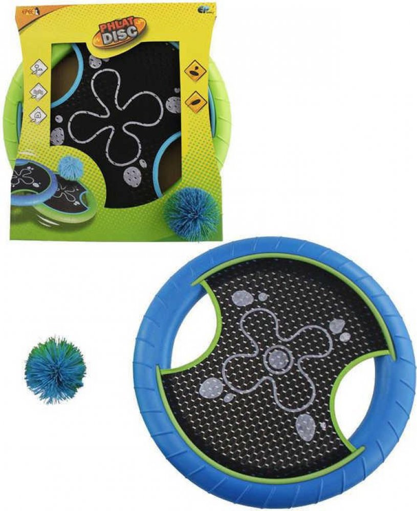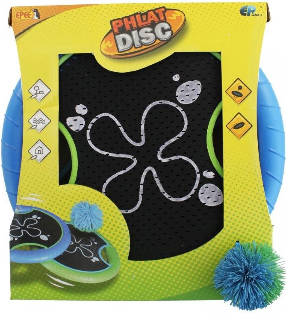 Phlat disc! Revoluční zábava doma i venku. Chlupatý míček a disk s textilním středem. Pinkejte si sami, pinkejte si mezi sebou. Přes síť nebo jenom tak. Trefujte se kamkoli, soutěžte, kdo dopinknete co nejdál. Prostě si pinkejte. Doma, v parku, na zahradě, na pláži, na koupališti. Určitě vás to chytne. A to není všechno. Můžete si s ním házet i jako s létajícím talířem. Je to prostě Phlat disc záb...