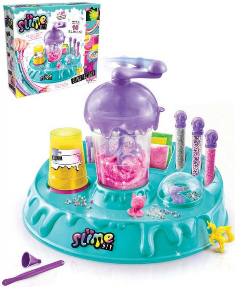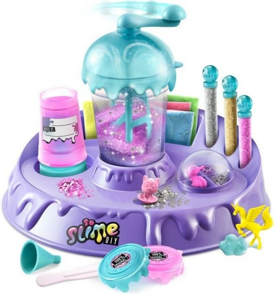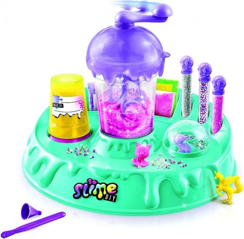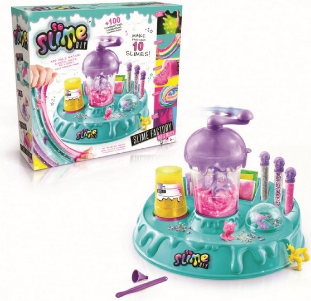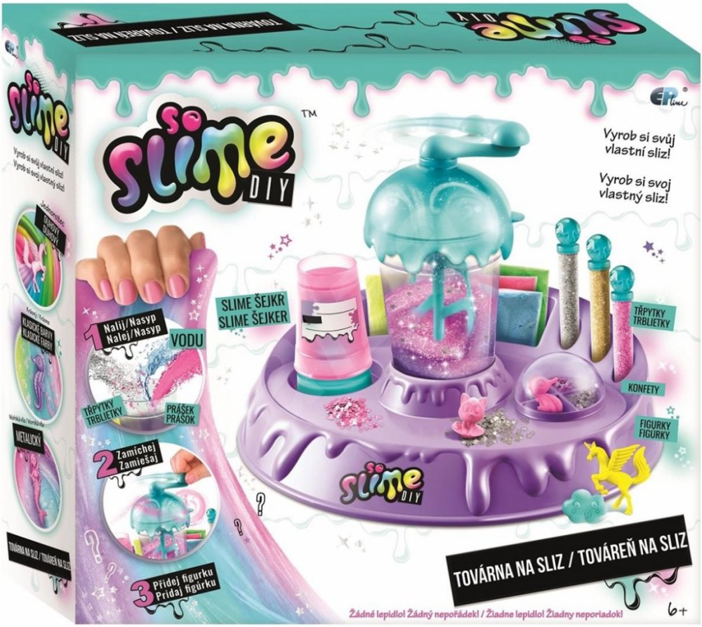 Balení obsahuje: továrna na sliz, 10 x sáček s práškem na výrobu slizu, konfety, třpytky, 4 x figurka, špachtličku, nálevku, 3 x kelímek, štítky.