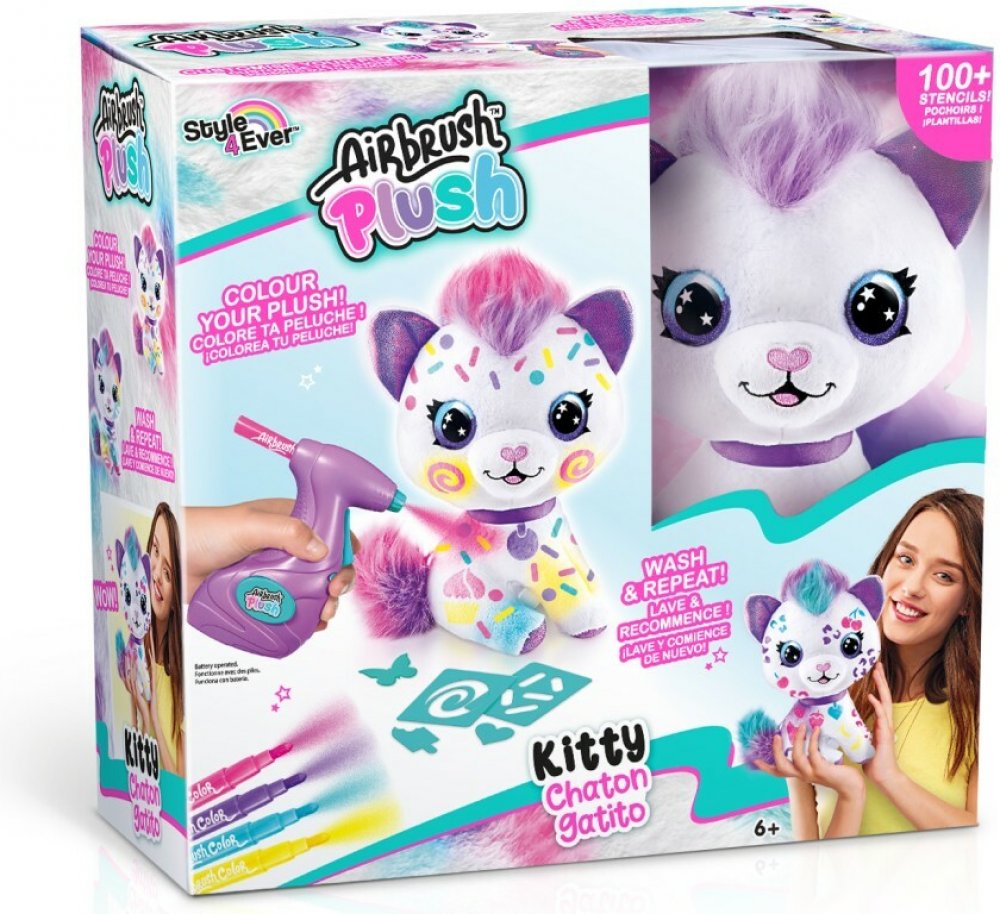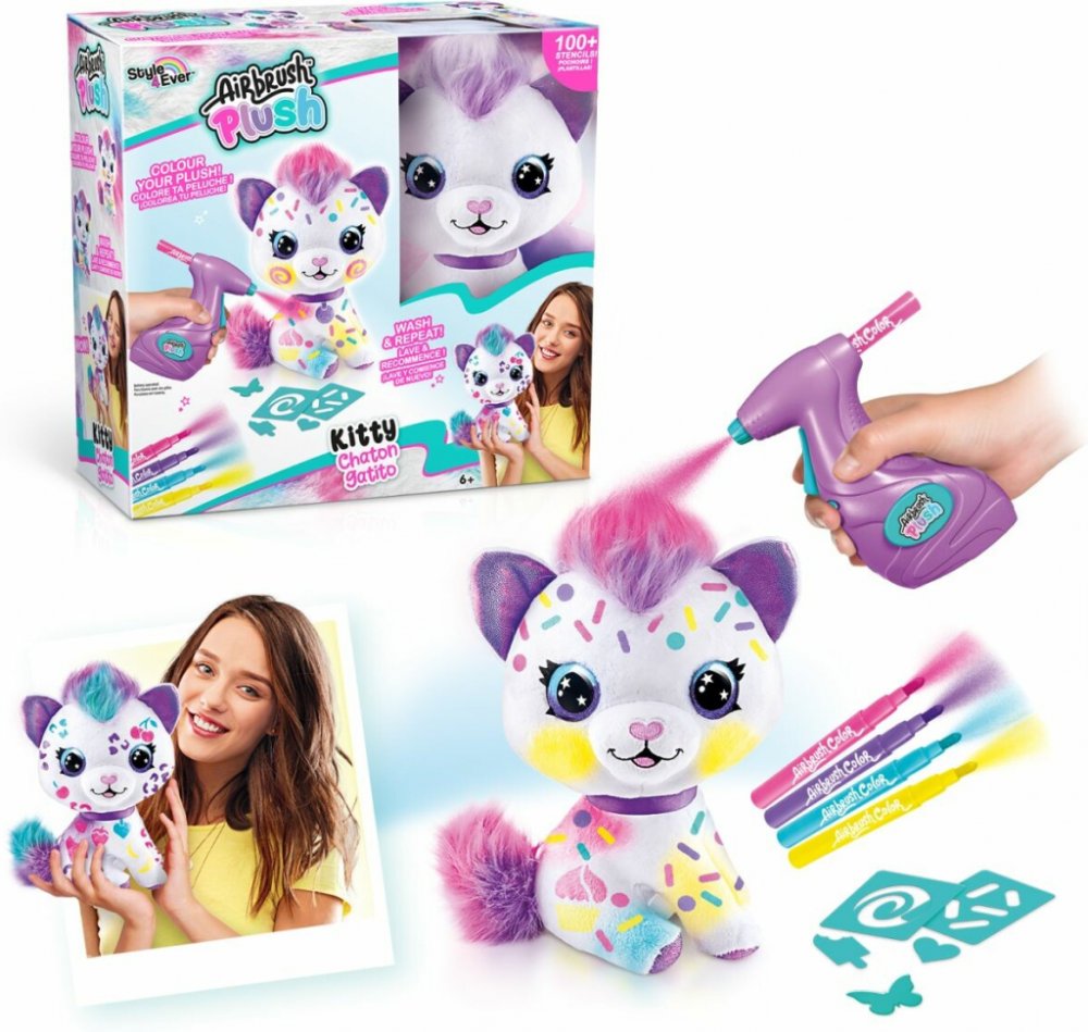 Navrhni a nabarvi si svého designového, barevného plyšáka a to pomocí airbrush pistole, která je napájená bateriemi. Na zdobení můžeš využít i různé šablony a barevné airbrush fixy. Součástí balení je: 1× plyšák, šablony, 4 barevné náplně, airbrush, návod. Výrobek je vhodné pro děti od 6 let. Výrobek vyžaduje 2× AA baterie (nejsou součástí balení).