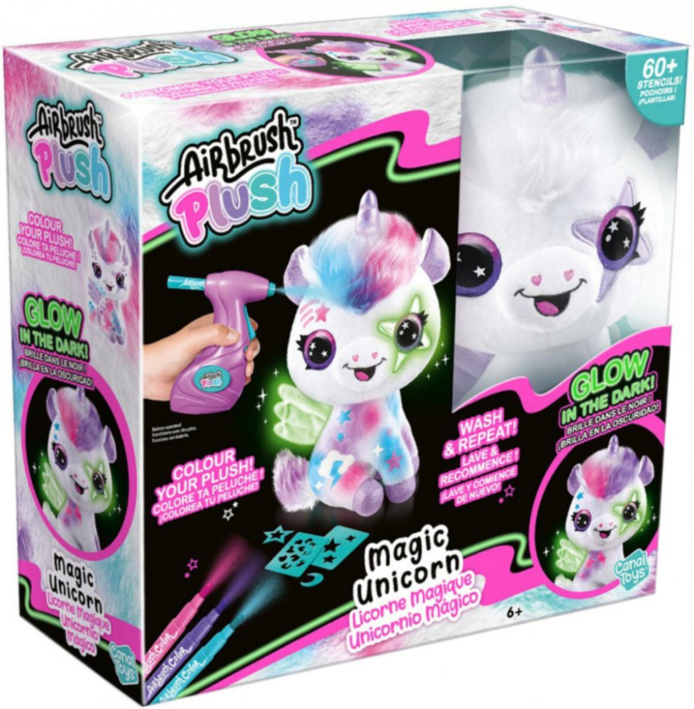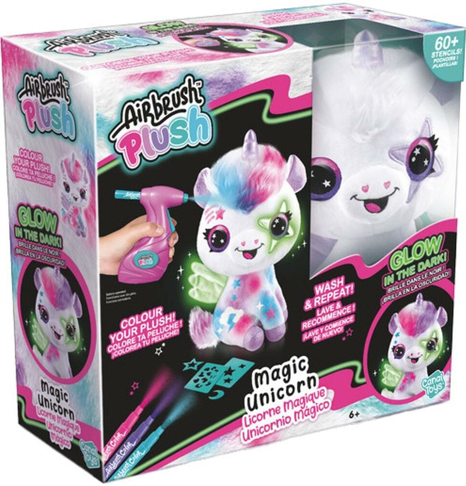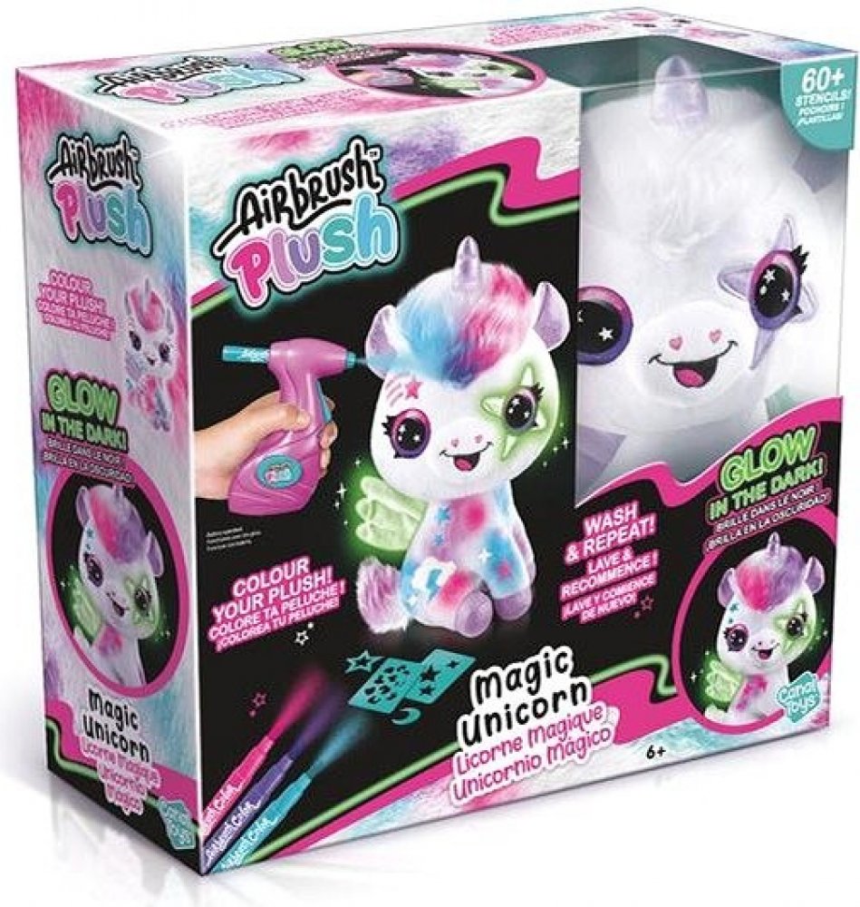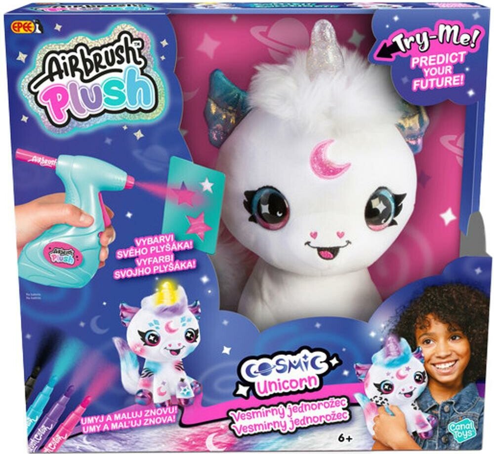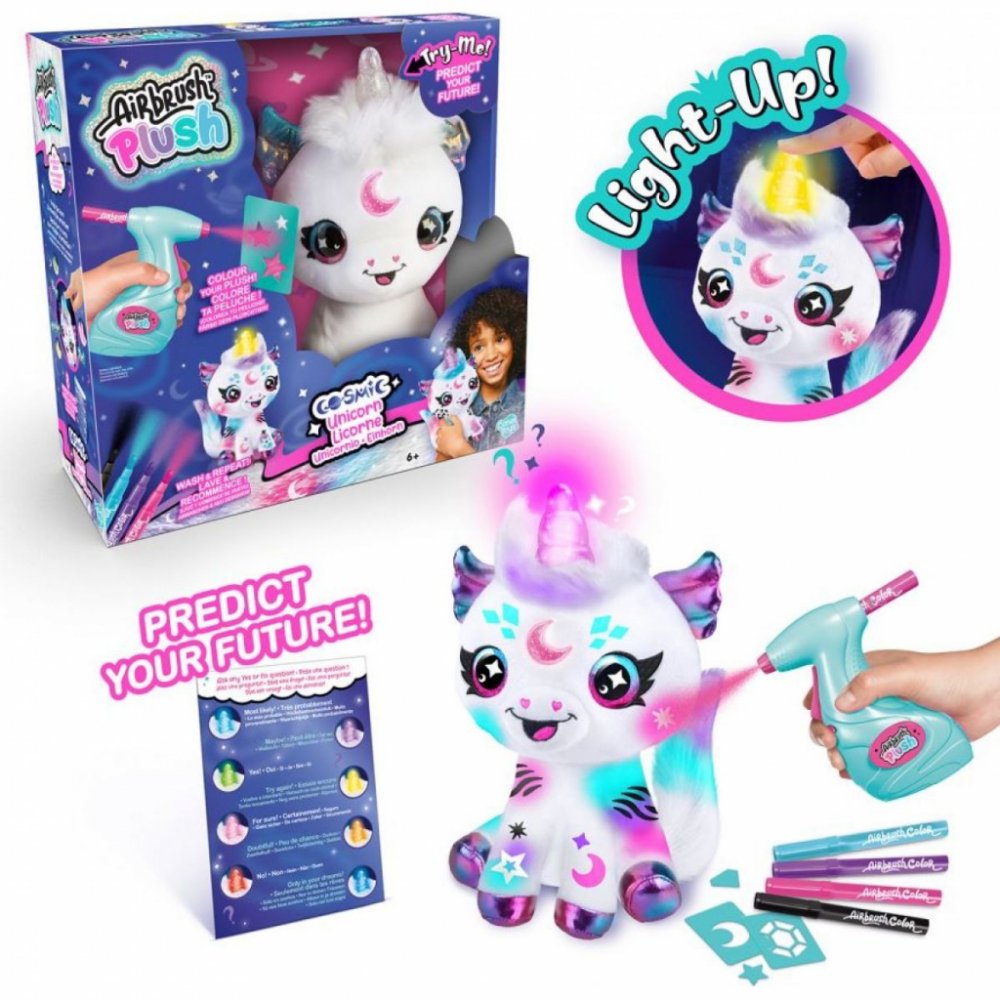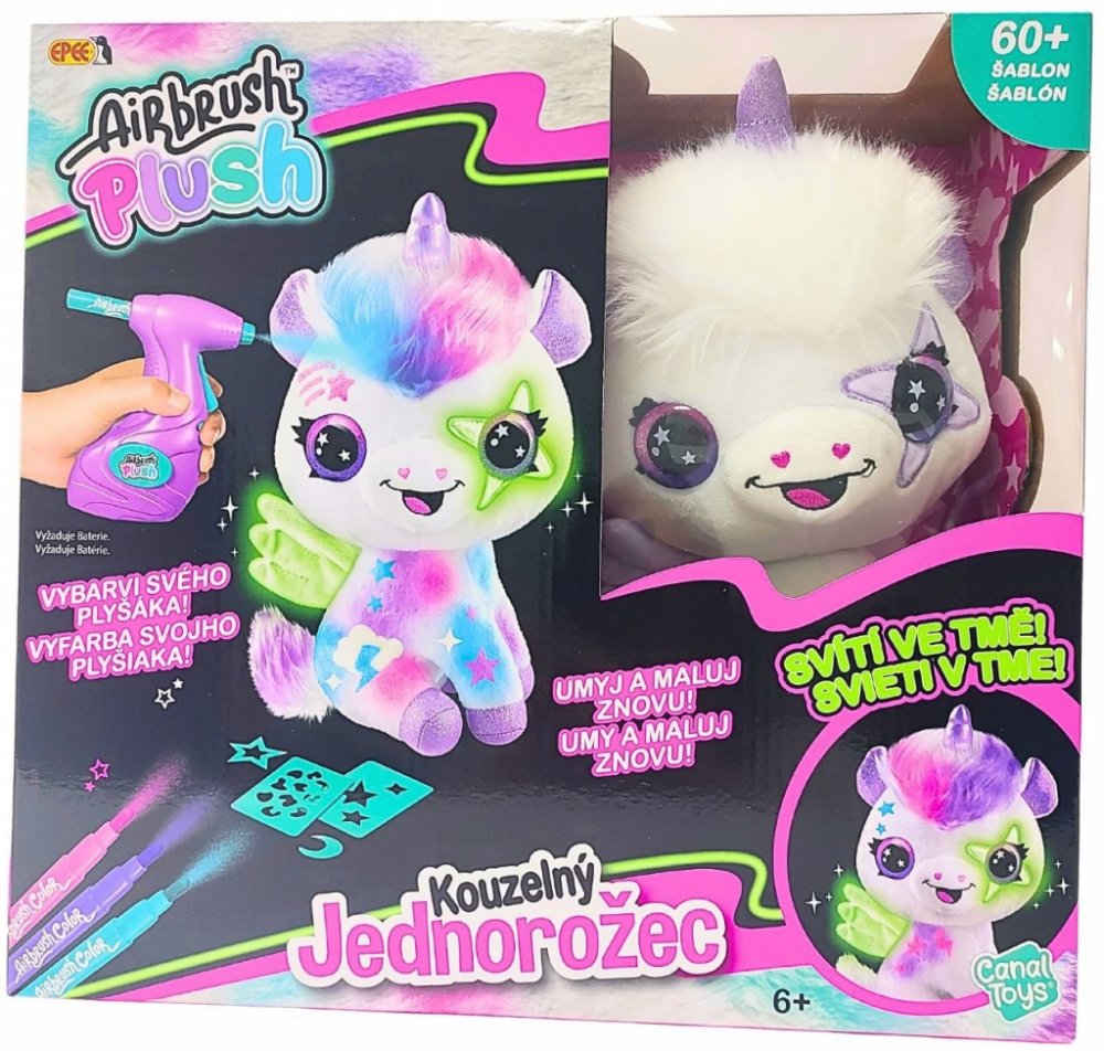 Plyšové zvířátko si můžeš pomocí airbrushe libovolně posprejovat, můžeš využít různé barvy a šablony. Fantazii se meze nekladou. Pokud se ti vytvořený design přestane líbit, stačí plyšáka omýt vodou a můžeš začít znovu. Plyšákovi svítí kouzelný roh a může odpovědět díky barvě rohu na otázku ano-ne.