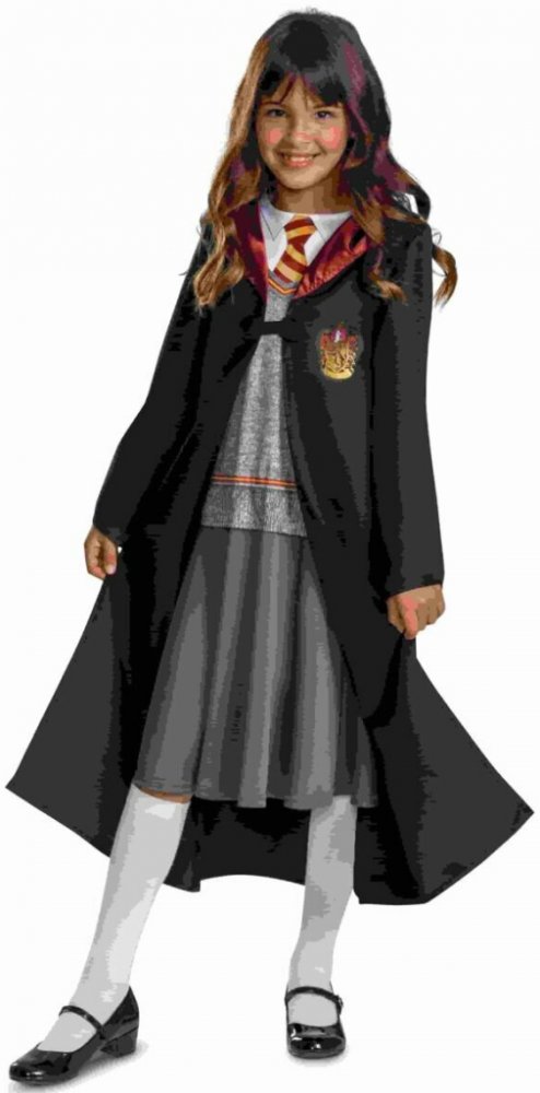 Kostým Hermiony Grangerové potěší všechny fanoušky světa Harryho Pottera, kteří se chtějí proměnit v jednu z nejchytřejších čarodějek své generace. Součástí je černý kouzelnický hábit s erbem Nebelvíru a všité šaty, které vytvářejí elegantní a věrný vzhled školního oděvu.