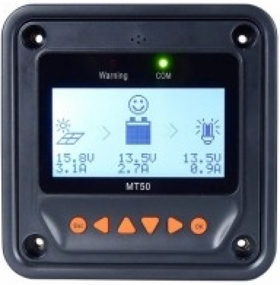 Externí displej Epever EPsolar MT50 funguje jako vzdálený ovladač pro solární regulátory EPsolar ze série XTRA, BN, A a LS (není kompatibilní s řadou DuoRacer). V reálném čase monitoruje a zobrazuje všechna důležitá data. Pomocí displeje přizpůsobíte provoz regulátoru podle vlastních potřeb, zapínáte a vypínáte připojená zařízení a jinou zátěž a nastavujete parametry nabíjení.