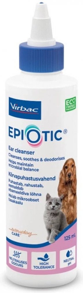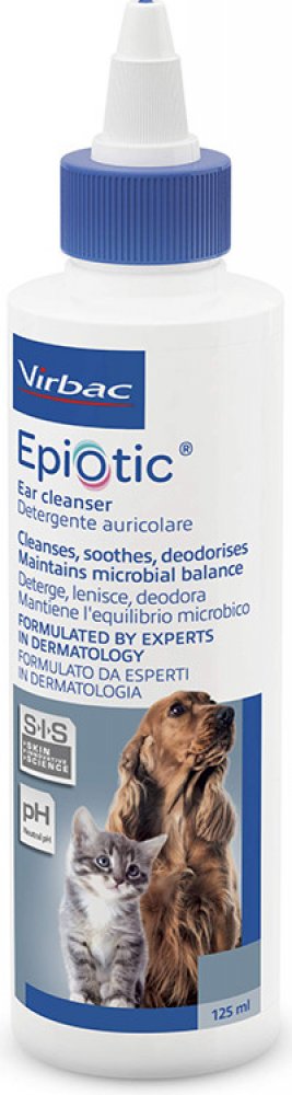 Epi-otic (Otitis externa) je antiseptický ušní čistič, nedráždivý, vysoušecí a bez alkoholu. Může být používán k bežnému čištění ucha a k usnadnění vyšetření ušního kanálku u psů a koček.