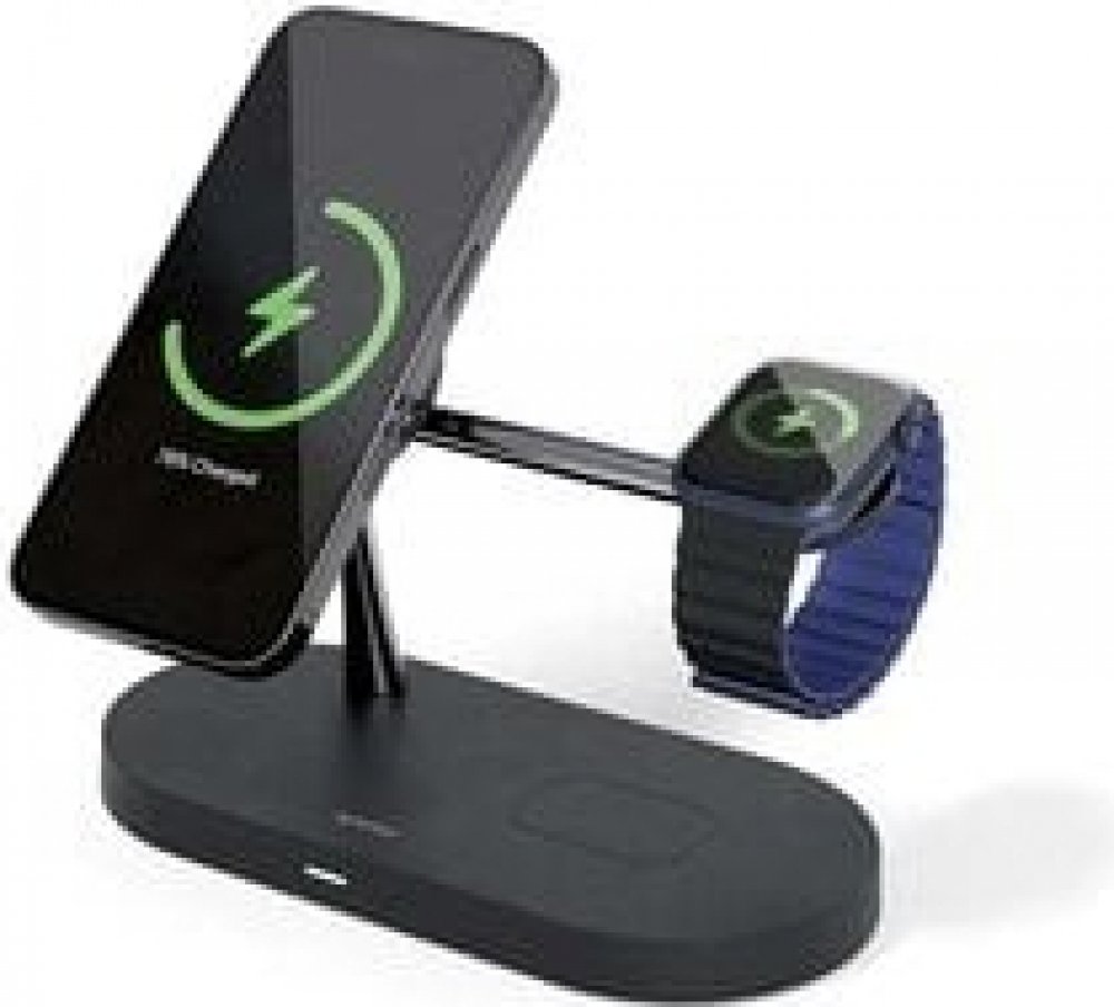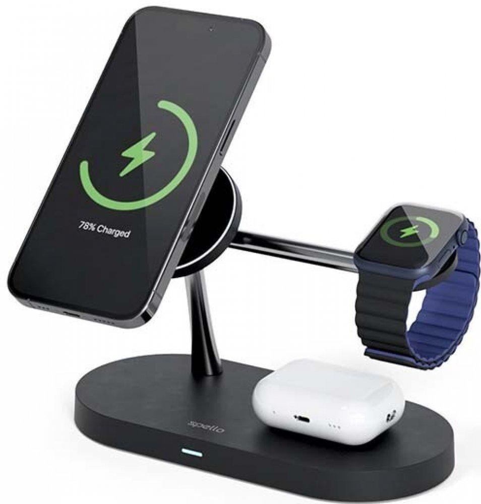 Udržujte všechna svá zařízení nabitá s magnetickým bezdrátovým nabíjecím stojanem Spello 3v1. Díky podpoře bezdrátového nabíjení pro všechna vaše zařízení můžete rychle napájet váš Smartphone (15 W) nebo iPhone (7,5 W), Apple Watch (3 W) a AirPods (3 W) současně, takže budou nabitá a připravená, ať jste kdekoli. Kompatibilní s MagSafe technologií.