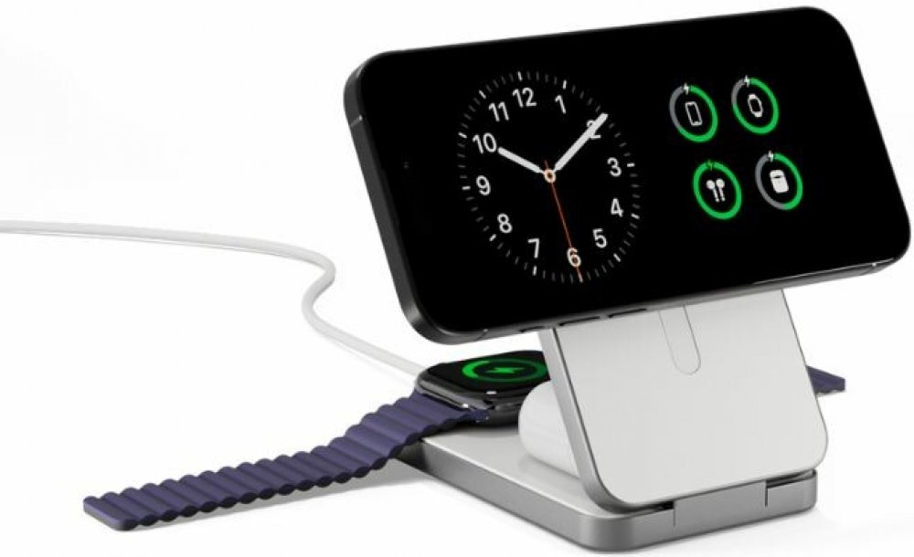Bezdrátový nabíjecí stojánek + Powerbanka 8000 mAh (design 4v1) • Qi2 a MagSafe kompatibilní • Nabíjení až 4 zařízení současně (vč. Apple Watch 5W) • USB-C 20W PD (vstup/výstup) • Kompaktní skládací hliníkové tělo (StandBy režim)