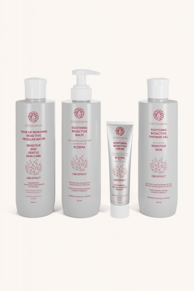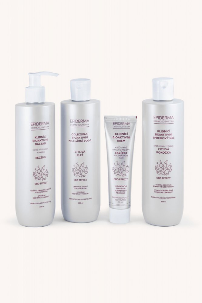 Epiderma Bioaktivní kosmetika CBD balzám při ekzému 300 ml + CBD krém při ekzému 50 ml + CBD sprchový gel při ekzému 300 ml + CBD micelární odličovací voda 300 ml dárková sada