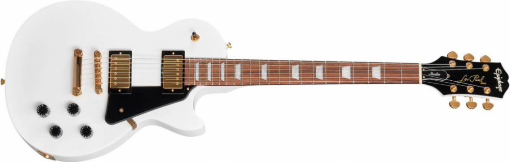 Elektrická kytara Elektrické kytary typu Les Paul od firmy Epiphone představují již po několik desetiletí finančně dostupnější alternativu originálů s logem Gibson. Konkrétně řada Les Paul Studio nabízí modernizované verze modelů z 80. let původně určených pro studiové muzikanty, kteří požadovali kytaru s jednoduchým designem, klasickým Les Paul zvukem a menší hmotností než nástroje Les Paul Standard. Mahagonové tělo modelu Les Paul Studio Alpine White doplňuje vrchní javorová dýha. K mahagonovému krku s „1960s SlimTaper D“ profilem je přilepen hmatník z fíkovníku osazený dvaadvaceti pražci velikosti Medium Jumbo. Orientaci po jeho ploše usnadňují polohové bloky. Dva tovární humbuckery Alnico Classic Pro poskytnou vašemu kytarovému zvuku potřebnou průraznost, plnost a vřelost. Charakter zvuku lze upravovat pomocí dvou potenciometrů hlasitosti, tónových clon a třípolohovým přepínačem snímačů. Rychlé a přesné ladění a dobrý sustain zajišťují kvalitní mechaniky Grover s převodovým poměrem 18:1 a plně nastavitelná kobylka Locktone Tune-o-matic se struníkem. Stylový vzhled podtrhuje černý pickguard a logo na hlavici kytary.