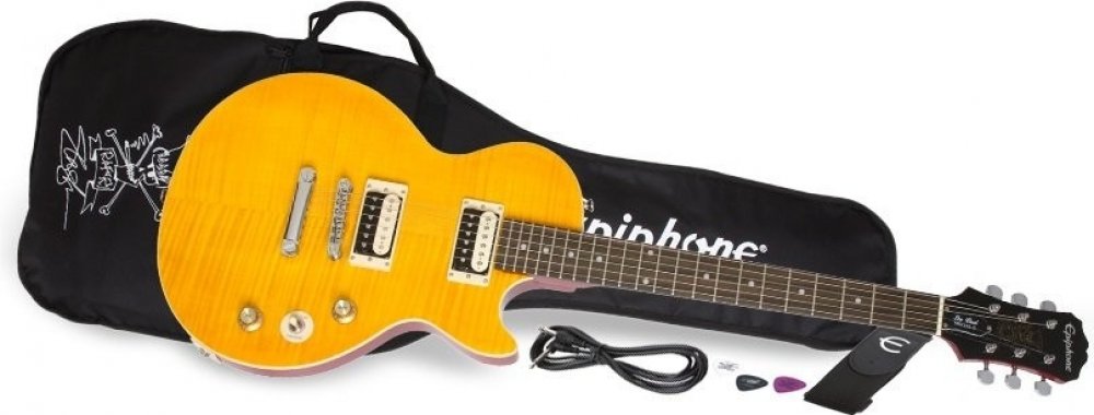kytarový set pro začátečníky se Slashovým rukopisem. Set obsahuje elektrickou kytaru typu Les Paul Special II s vrchní deskou se žíhaného Veneer javoru, tělem vyrobeným z mahagonu a mahagonovým krkem. Palisandrový hmatník je osazen 22 pražci. Nástroj disponuje chromovým hardwarem,