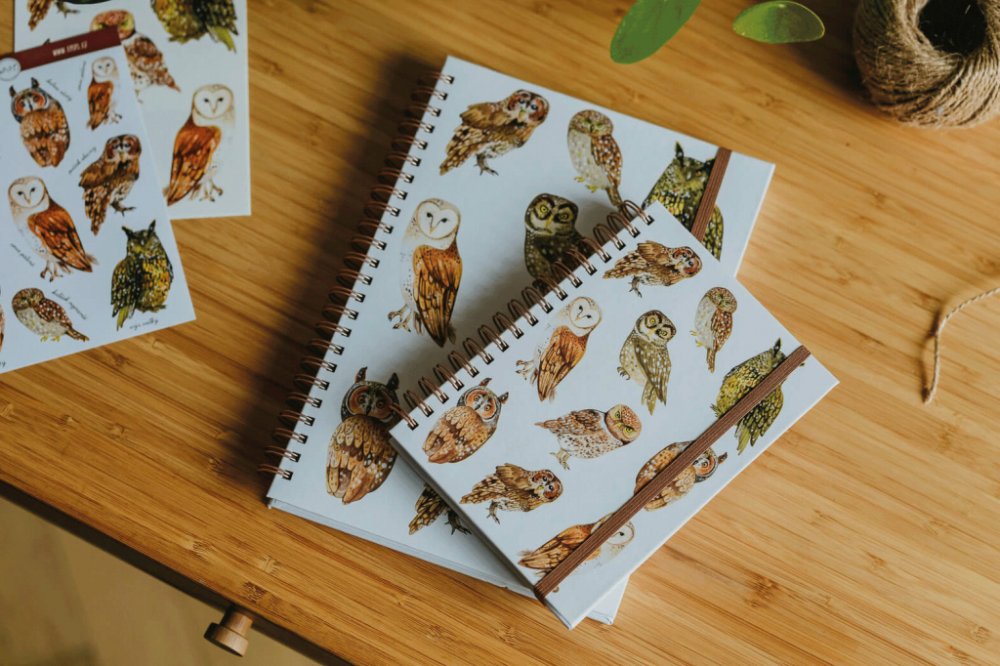 Pevné kašírované desky zdobené autorskou ilustrací českých sov jsou potažené sametovou laminací, která je na dotek hebká a odolná. Diář je opatřen elastickou gumičkou v hnědé barvě pro bezpečné zavření. Velikost diáře je praktická a skladná, díky malému rozměru se vám diář vejde i do menší tašky nebo batohu a můžete jej mít neustále u sebe pro rychlé zapisování. Diář nabízíme ve dvou praktických velikostech – A5 pro více prostoru na psaní a A6 jako skladnou verzi do kabelky či batohu.