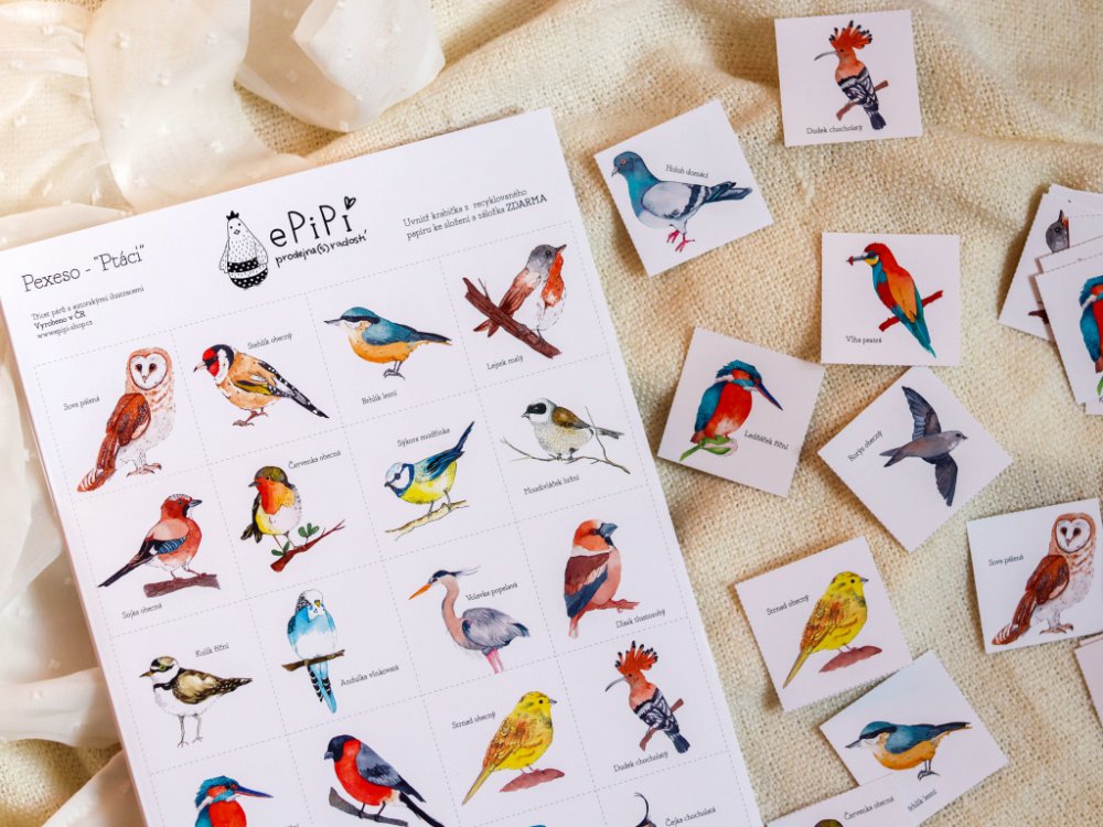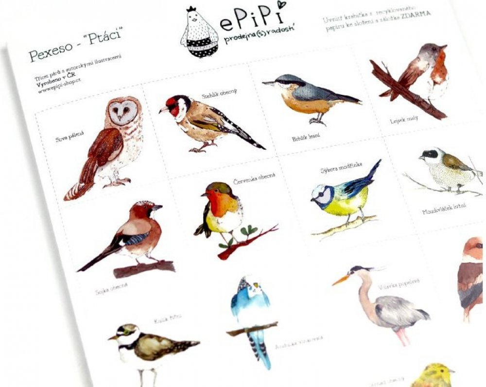 30 párů kartiček o velikosti 5x5 cm tištěné na 300g matném křídovém papíru, které mohou vystříhat i děti, a kreativně se tak zabavit. V balíčku najdete k vystřižení také záložku do knihy nebo krabičku z recyklovaného papíru, ve které můžete uchovávat své pexeso, aby se vám jednotlivé dílky nepoztrácely. Na každém dílku je popis, o jaký druh ptáčka se jedná, takže se při hře můžete i naučit názvy nových druhů, které jste dříve neznali.
