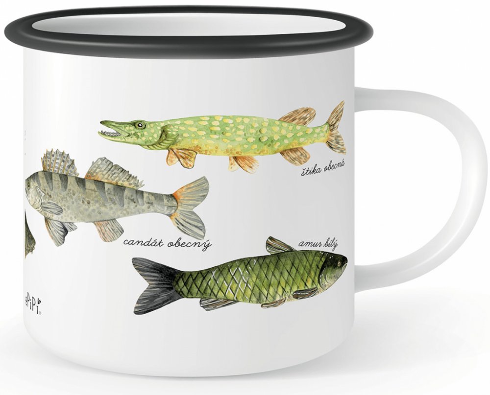 Smaltovaný hrneček neboli plecháček, který je zdobený černým lemem. Plecháček je potištěný po celé ploše, potisk končí zhruba 2 cm od ucha a zdobí jej naše autorská ilustrace ryb, která byla v originále malovaná akvarelem. Druhy ryb které na plecháčku najdete: štika obecná, candát obecný, amur bílý, pstruh obecný (potoční), kapr obecný, sumec velký a okoun říční.