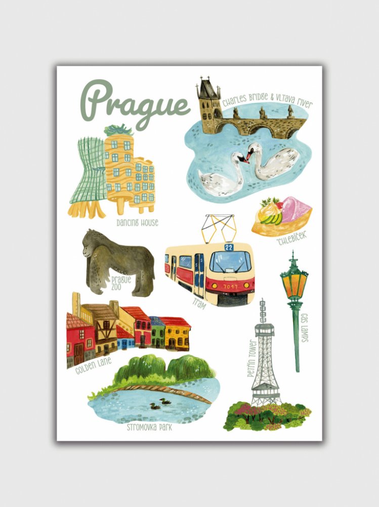Pohlednice s ilustracemi známých pražských míst a symbolů s popisky v angličtině. Najdete na ní Tančící dům, Karlův most s labutěmi, tramvaj, Petřínskou rozhlednu, pražskou zoo, chlebíček nebo třeba malebnou Zlatou uličku. Barevný a hravý motiv potěší nejen sběratele, ale i všechny milovníky hlavního města.Z druhé strany má pohlednice natištěné linky na napsání adresy.