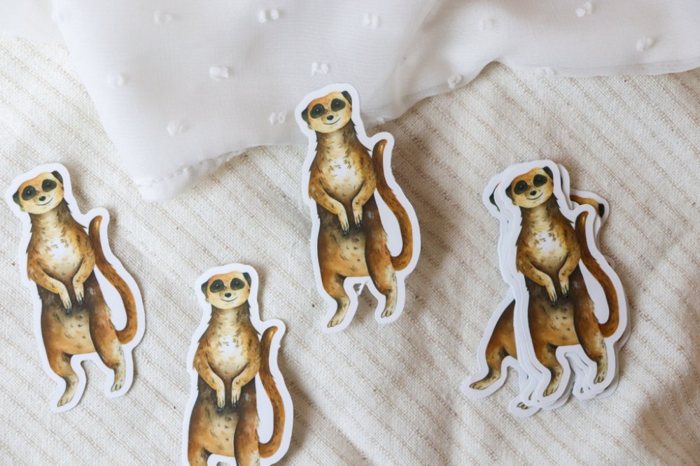 Samolepka s autorskou ilustrací, oříznutá ve tvaru surikaty. Samolepka je vyrobena z kvalitního PVC materiálu a je opatřena matnou laminací. Díky laminaci je samolepka vysoce odolná vůči, vodě, vlhkosti, chemikáliím, povětrnostním vlivům, slunečnímu záření, otěru, abrazi a roztržení. Ideální k dekorování jakéhokoliv povrchu - lze ji nalepit nejen do zápisníků a diářů, ale také například na telefon nebo laptop, případně je vhodná i pro dlouhodobé venkovní použití (na auto, kufr, apod.).